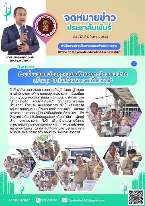 วันที่ 6 สิงหาคม 2568 นายมาหะมัดยูรี โตะสะ ผู้อำนวยการสำนักงานการศึกษาเอกชนอำเภอบาเจาะ ร่วมเยี่ยมชมและร่วมอุดหนุนสินค้าในตลาดนัดชุมชน ปาโจ สร้างสุข "ปาโจสร้างรัก รายได้สร้างสุข" ตามโครงการอำเภอบำบัดทุกข์ บำรุงสุข แบบบูรณาการ ซึ่งเป็นผลิตผลจากกลุ่มวิสาหกิจชุมชนแม่บ้านประมงอำเภอบาเจาะ ผลิตผลทางการเกษตรจากหมู่บ้านยั่งยืนผลิตภัณฑ์(OTOP) ซึ่งจัดจำหน่ายสิ้นค้าในวันประชุมประจำเดือนกำนัน ผู้ใหญ่บ้าน อำเภอบาเจาะ ทั้งนี้ เพื่อสร้างช่องทางในการจำหน่ายสินค้ากระตุ้นเศรษฐกิจฐานราก เพิ่มรายได้ให้แก่กลุ่มอาชีพในพื้นที่ ณ ตลาดปาโจสร้างสุข บริเวณอาคารอเนกประสงค์ ที่ว่าการอำเภอบาเจาะ จังหวัดนราธิวาส