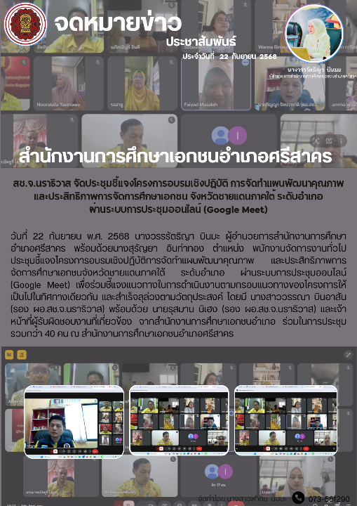 วันที่ 22 กันยายน พ.ศ. 2568 นางวรรรัตธิญา บินมะ ผู้อำนวยการสำนักงานการศึกษาอำเภอศรีสาคร พร้อมด้วยนางสุรัญยา อินท่าทอง ตำเเหน่ง พนักงานจัดการงานทั่วไป ประชุมชี้แจงโครงการอบรมเชิงปฏิบัติการจัดทำแผนพัฒนาคุณภาพ และประสิทธิภาพการจัดการศึกษาเอกชนจังหวัดชายแดนภาคใต้ ระดับอำเภอ ผ่านระบบการประชุมออนไลน์ (Google Meet) เพื่อร่วมชี้แจงแนวทางในการดำเนินงานตามกรอบแนวทางของโครงการให้เป็นไปในทิศทางเดียวกัน และสำเร็จลุล่วงตามวัตถุประสงค์ โดยมี นางสาววรรณา บินอาสัน (รอง ผอ.สช.จ.นราธิวาส) พร้อมด้วย นายรุสมาน นิเฮง (รอง ผอ.สช.จ.นราธิวาส) และเจ้าหน้าที่ผู้รับผิดชอบงานที่เกี่ยวข้อง จากสำนักงานการศึกษาเอกชนอำเภอ ร่วมในการประชุมรวมกว่า 40 คน ณ สำนักงานการศึกษาเอกชนอำเภอศรีสาคร