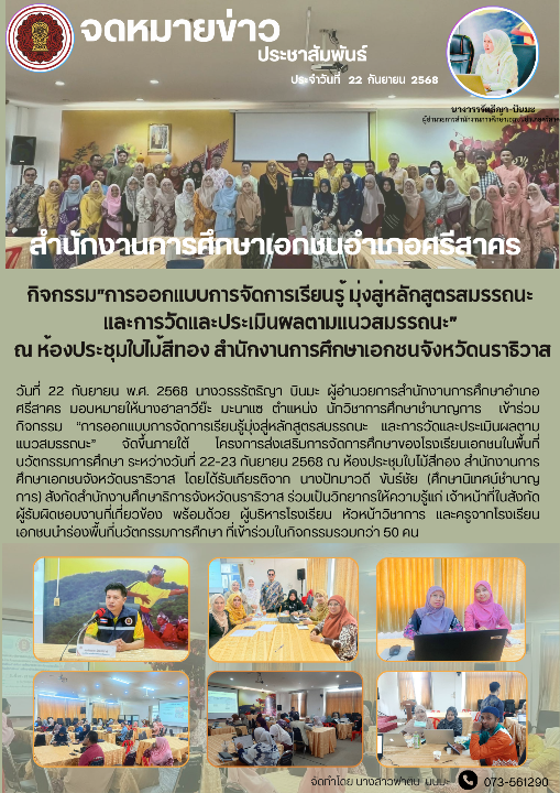 วันที่ 22 กันยายน พ.ศ. 2568 นางวรรรัตธิญา บินมะ ผู้อำนวยการสำนักงานการศึกษาอำเภอศรีสาคร มอบหมายให้นางฮาลาวีย๊ะ มะนาแซ ตำแหน่ง นักวิชาการศึกษาชำนาญการ เข้าร่วมกิจกรรม “การออกแบบการจัดการเรียนรู้มุ่งสู่หลักสูตรสมรรถนะ และการวัดและประเมินผลตามแนวสมรรถนะ” จัดขึ้นภายใต้ โครงการส่งเสริมการจัดการศึกษาของโรงเรียนเอกชนในพื้นที่นวัตกรรมการศึกษา ระหว่างวันที่ 22-23 กันยายน 2568 ณ ห้องประชุมใบไม้สีทอง สำนักงานการศึกษาเอกชนจังหวัดนราธิวาส โดยได้รับเกียรติจาก นางปัทมาวดี ขันธ์ชัย (ศึกษานิเทศน์ชำนาญการ) สังกัดสำนักงานศึกษาธิการจังหวัดนราธิวาส ร่วมเป็นวิทยากรให้ความรู้แก่ เจ้าหน้าที่ในสังกัดผู้รับผิดชอบงานที่เกี่ยวข้อง พร้อมด้วย ผู้บริหารโรงเรียน หัวหน้าวิชาการ และครูจากโรงเรียนเอกชนนำร่องพื้นที่นวัตกรรมการศึกษา ที่เข้าร่วมในกิจกรรมรวมกว่า 50 คน