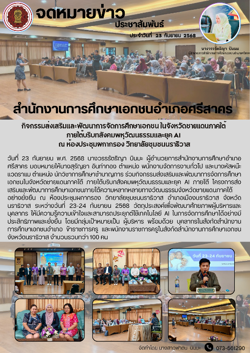 วันที่ 23 กันยายน พ.ศ. 2568 นางวรรรัตธิญา บินมะ ผู้อำนวยการสำนักงานการศึกษาอำเภอศรีสาคร มอบหมายให้นางสุรัญยา อินท่าทอง ตำเเหน่ง พนักงานจัดการงานทั่วไป เเละนางหัสหน๊ะ เเวดราเเม ตำเเหน่ง นักวิชาการศึกษาชำนาญการ ร่วมกิจกรรมส่งเสริมและพัฒนาการจัดการศึกษาเอกชนในจังหวัดชายแดนภาคใต้ ภายใต้บริบทสังคมพหุวัฒนธรรมและยุค AI ภายใต้ โครงการส่งเสริมและพัฒนาการศึกษาเอกชนภายใต้ความหลากหลายทางวัฒนธรรมจังหวัดชายแดนภาคใต้อย่างยั่งยืน ณ ห้องประชุมผกากรอง วิทยาลัยชุมชนนราธิวาส อำเภอเมืองนราธิวาส จังหวัดนราธิวาส ระหว่างวันที่ 23-24 กันยายน 2568 วัตถุประสงค์เพื่อพัฒนาศักยภาพผู้บริหารและบุคลากร ให้มีความรู้ความเข้าใจและสามารถประยุกต์ใช้เทคโนโลยี AI ในการจัดการศึกษาได้อย่างมีประสิทธิภาพและยั่งยืน โดยมีกลุ่มเป้าหมายเป็น ผู้บริหาร พร้อมด้วย บุคลากรในสังกัดสำนักงานการศึกษาเอกชนอำเภอ ข้าราชการครู และพนักงานราชการครูในสังกัดสำนักงานการศึกษาเอกชนจังหวัดนราธิวาส จำนวนรวมกว่า 100 คน