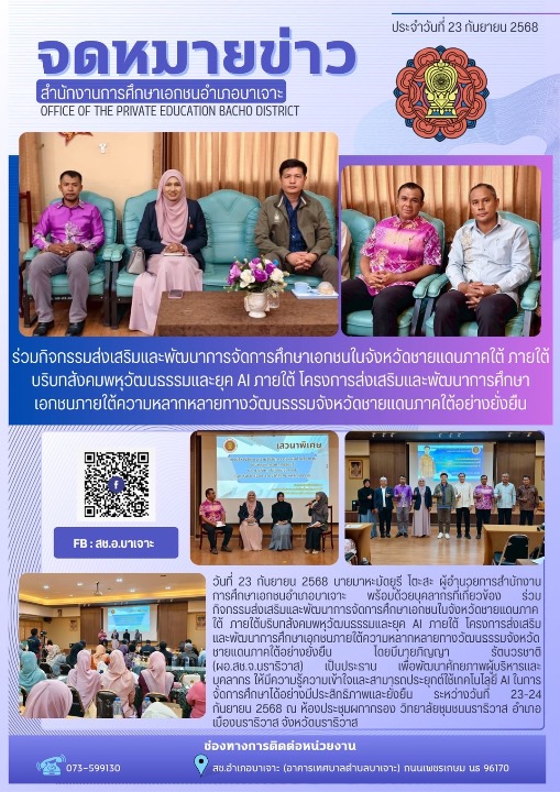 วันที่ 23 กันยายน 2568 นายมาหะมัดยูรี โตะสะ ผู้อำนวยการสำนักงานการศึกษาเอกชนอำเภอบาเจาะ พร้อมด้วยบุคลากรที่เกี่ยวข้องร่วมกิจกรรมส่งเสริมและพัฒนาการจัดการศึกษาเอกชนในจังหวัดชายแดนภาคใต้ ภายใต้บริบทสังคมพหุวัฒนธรรมและยุค AI ภายใต้ โครงการส่งเสริมและพัฒนาการศึกษาเอกชนภายใต้ความหลากหลายทางวัฒนธรรมจังหวัดชายแดนภาคใต้อย่างยั่งยืน โดยมีนายภิญญา รัตนวรชาติ (ผอ.สช.จ.นราธิวาส) เป็นประธาน เพื่อพัฒนาศักยภาพผู้บริหารและบุคลากร ให้มีความรู้ความเข้าใจและสามารถประยุกต์ใช้เทคโนโลยี AI ในการจัดการศึกษาได้อย่างมีประสิทธิภาพและยั่งยืน ระหว่างวันที่ 23-24 กันยายน 2568 ณ ห้องประชุมผกากรอง วิทยาลัยชุมชนนราธิวาส อำเภอเมืองนราธิวาส จังหวัดนราธิวาส