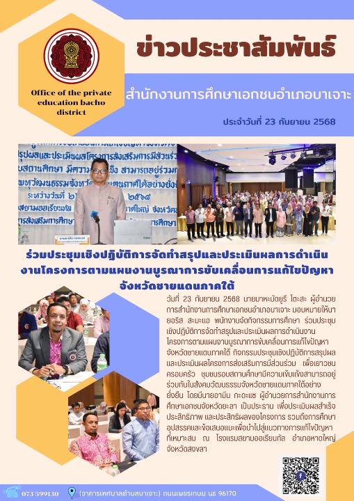 วันที่ 23 กันยายน 2568 นายมาหะมัดยูรี โตะสะ ผู้อำนวยการสำนักงานการศึกษาเอกชนอำเภอบาเจาะ มอบหมายให้นายอริส สะมะแอ พนักงานจัดกิจกรรมการศึกษา ร่วมประชุมเชิงปฏิบัติการจัดทำสรุปและประเมินผลการดำเนินงานโครงการตามแผนงานบูรณาการขับเคลื่อนการแก้ไขปัญหาจังหวัดชายแดนภาคใต้ กิจกรรมประชุมเชิงปฏิบัติการสรุปผลและประเมินผลโครงการส่งเสริมการมีส่วนร่วม เพื่อเยาวชน ครอบครัว ชุมชนรอบสถานศึกษามีความเข้มแข็งสามารถอยู่ร่วมกันในสังคมวัฒนธรรมจังหวัดชายแดนภาคใต้อย่างยั่งยืน โดยมีนายอามีน กะดะแซ ผู้อำนวยการสำนักงานการศึกษาเอกชนจังหวัดยะลา เป็นประธาน เพื่อประเมินผลสำเร็จ ประสิทธิภาพ และประสิทธิผลของโครงการ รวมถึงการศึกษาอุปสรรคและข้อเสนอแนะเพื่อนำไปสู่แนวทางการแก้ไขปัญหาที่เหมาะสม ณ โรงแรมสยามออเรียนทัล อำเภอหาดใหญ่ จังหวัดสงขลา