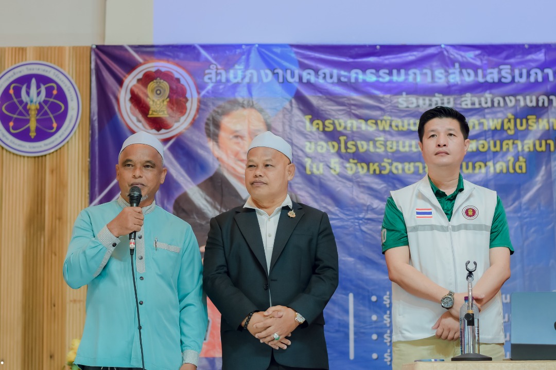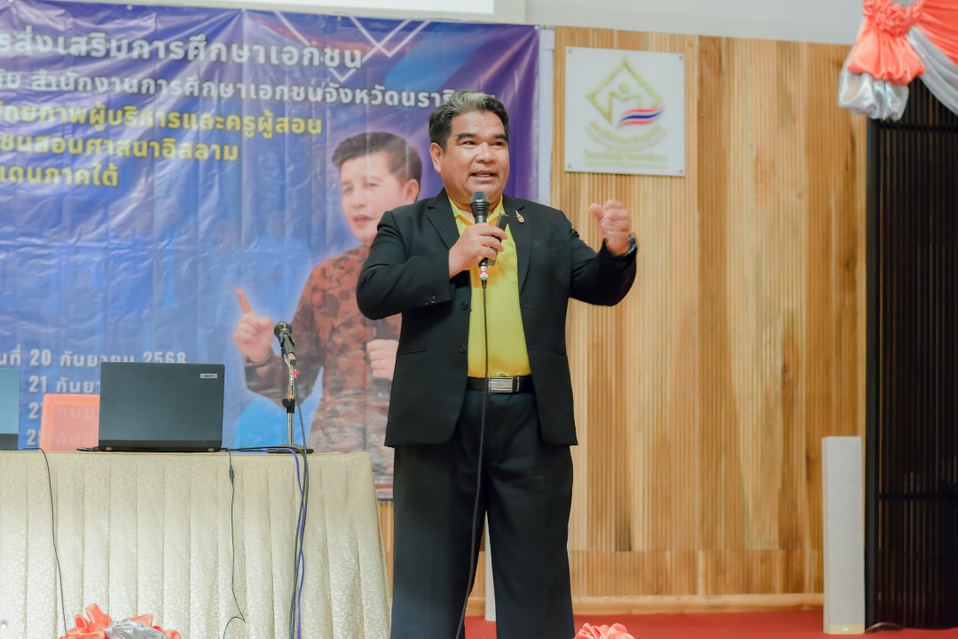 วันที่ 24 กันยายน พ.ศ. 2568 เวลา 09:00 น. นายภิญญา รัตนวรชาติ (ผอ.สช.จ.นราธิวาส) ประธานในพิธีเปิดโครงการพัฒนาศักยภาพผู้บริหารและครูผู้สอนของโรงเรียนเอกชนสอนศาสนาอิสลามใน 5 จังหวัดชายแดนใต้ (รุ่นที่ 6) ณ หอประชุมกระจูด วิทยาลัยชุมชนนราธิวาส อ.เมืองนราธิวาส จ.นราธิวาส โครงการดังกล่าว มีวัตถุประสงค์เพื่อเสริมสร้างความรู้และความเข้าใจ ร่วมพัฒนาศักยภาพของผู้บริหารและครูผู้สอนของโรงเรียนเอกชนสอนศาสนาอิสลามให้มีความพร้อมในการจัดการศึกษาอย่างมีคุณภาพ ปลูกฝังคุณธรรม จริยธรรม และการธำรงไว้ซึ่งสถาบันหลักของชาติ คือ ชาติ ศาสนา และพระมหากษัตริย์ โดยมีผู้สอนของศูนย์ศึกษาอิสลามประจำมัสยิด (ตาดีกา) ในสังกัด สช.อ.ศรีสาคร สช.อ.สุไหงปาดี และ สช.อ.จะแนะ เข้าร่วมในโครงการฯ รวมกว่า 800 คน รูปภาพเพิ่มเติม
