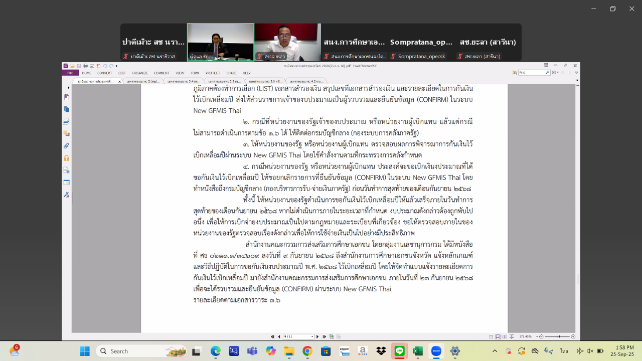 วันที่ 25 กันยายน พ.ศ. 2568 เวลา 13:30 น. นายมณฑล ภาคสุวรรณ์ ประธานการประชุมคณะทำงานเร่งรัดติดตามการใช้จ่ายงบประมาณรายจ่าย ประจำปีงบประมาณ 2568 ครั้งที่ 6/2568 ผ่านระบบการประชุมออนไลน์ (Zoom Meeting) โดย นายภิญญา รัตนวรชาติ (ผอ.สช.จ.นราธิวาส) ได้มอบหมายให้ นางสาววรรณา บินอาสัน (รอง ผอ.สช.จนราธิวาส) พร้อมด้วย คณะบุคลากรกลุ่มแผนงานและยุทธศาสตร์ เข้าร่วมในประชุม เพื่อรับทราบแนวทางการบริหารจัดการงบประมาณ และการเร่งรัดการเบิกจ่าย ตลอดจนร่วมติดตามผล การดำเนินงานโครงการต่าง ๆ ให้เป็นไปตามกรอบระยะเวลาที่กำหนด บรรลุตามเป้าหมายของส่วนราชการอย่างมีประสิทธิภาพ