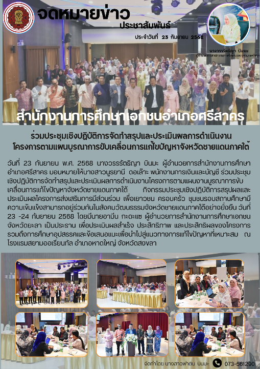 วันที่ 23 กันยายน พ.ศ. 2568 นางวรรรัตธิญา บินมะ ผู้อำนวยการสำนักงานการศึกษาอำเภอศรีสาคร มอบหมายให้นางสาวนูรยานี ดอเล๊าะ พนักงานการเงินเเละบัญชี ร่วมประชุมเชิงปฏิบัติการจัดทำสรุปและประเมินผลการดำเนินงานโครงการตามแผนงานบูรณาการขับเคลื่อนการแก้ไขปัญหาจังหวัดชายแดนภาคใต้ กิจกรรมประชุมเชิงปฏิบัติการสรุปผลและประเมินผลโครงการส่งเสริมการมีส่วนร่วม เพื่อเยาวชน ครอบครัว ชุมชนรอบสถานศึกษามีความเข้มแข็งสามารถอยู่ร่วมกันในสังคมวัฒนธรรมจังหวัดชายแดนภาคใต้อย่างยั่งยืน วันที่ 23 -24 กันยายน 2568 โดยมีนายอามีน กะดะแซ ผู้อำนวยการสำนักงานการศึกษาเอกชนจังหวัดยะลา เป็นประธาน เพื่อประเมินผลสำเร็จ ประสิทธิภาพ และประสิทธิผลของโครงการ รวมถึงการศึกษาอุปสรรคและข้อเสนอแนะเพื่อนำไปสู่แนวทางการแก้ไขปัญหาที่เหมาะสม ณ โรงแรมสยามออเรียนทัล อำเภอหาดใหญ่ จังหวัดสงขลา