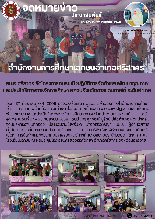 วันที่ 27 กันยายน พ.ศ. 2568 นางวรรรัตธิญา บินมะ ผู้อำนวยการสำนักงานการศึกษาอำเภอศรีสาคร พร้อมด้วยคณะทำงานในสังกัด จัดโครงการอบรมเชิงปฏิบัติการจัดทำแผนพัฒนาคุณภาพและประสิทธิภาพการจัดการศึกษาเอกชนจังหวัดชายแดนภาคใต้ ระดับอำเภอ ในวันที่ 27 - 28 กันยายน 2568 โดยมี นายศุภวัฒน์ ชูรัตน์ ปลัดอำเภอ หัวหน้ากลุ่มงานบริหารงานปกครอง เป็นประธานในพิธีเปิด นางวรรรัตธิญา บินมะ ผู้อำนวยการสำนักงานการศึกษาเอกชนอำเภอศรีสาคร ได้กล่าวให้กำลังใจผู้เข้าร่วมอบรม เกี่ยวกับเนื้อหาการจัดทำแผนพัฒนาคุณภาพของศูนย์การศึกษาอิสลามประจำมัสยิด (ตาดีกา) และโรงเรียนเอกชน ณ หอประชุมโรงเรียนศรีสววรรค์วิทยา อำเภอศรีสาคร จังหวัดนราธิวาส