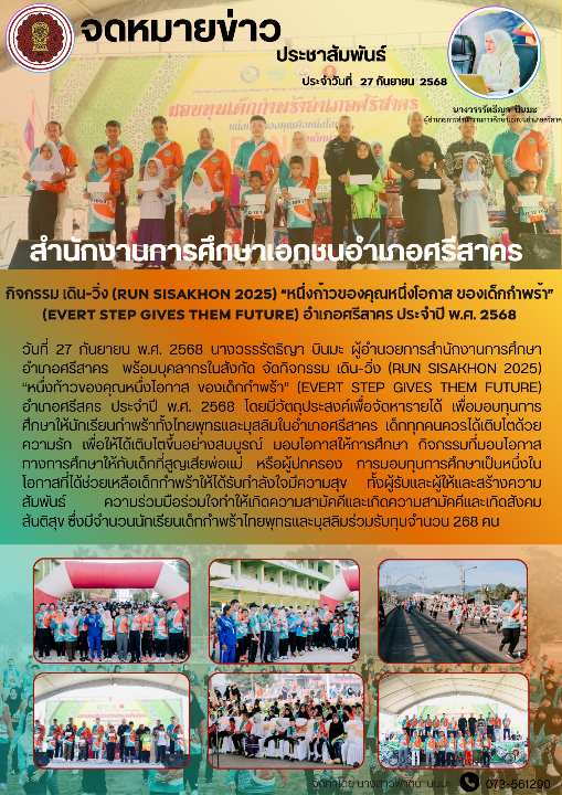 วันที่ 27 กันยายน พ.ศ. 2568 นางวรรรัตธิญา บินมะ ผู้อำนวยการสำนักงานการศึกษาอำเภอศรีสาคร พร้อมบุคลากรในสังกัด จัดกิจกรรม เดิน-วิ่ง (RUN SISAKHON 2025) “หนึ่งก้าวของคุณหนึ่งโอกาส ของเด็กกำพร้า” (EVERT STEP GIVES THEM FUTURE) อำเภอศรีสคร ประจำปี พ.ศ. 2568 โดยมีวัตถุประสงค์เพื่อจัดหารายได้ เพื่อมอบทุนการศึกษาให้นักเรียนกำพร้าทั้งไทยพุทธเเละมุสลิมในอำเภอศรีสาคร เด็กทุกคนควรได้เติบโตด้วยความรัก เพื่อให้ได้เติบโตขึ้นอย่างสมบูรณ์ มอบโอกาสให้การศึกษา กิจกรรมที่มอบโอกาสทางการศึกษาให้กับเด็กที่สูญเสียพ่อเเม่ หรือผู้ปกครอง การมอบทุนการศึกษาเป็นหนึ่งในโอกาสที่ได้ช่วยเหลือเด็กกำพร้าให้ได้รับกำลังใจมีความสุข ทั้งผู้รับเเละผู้ให้เเละสร้างความสัมพันธ์ ความร่วมมือร่วมใจทำให้เกิดความสามัคคีเเละเกิดความสามัคคีเเละเกิดสังคมสันติสุข ซึ่งมีจำนวนนักเรียนเด็กกำพร้าไทยพุทธเเละมุสลิมร่วมรับทุนจำนวน 268 คน