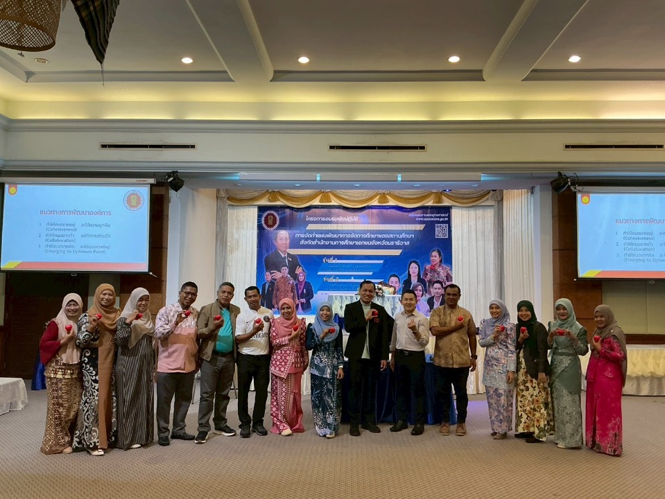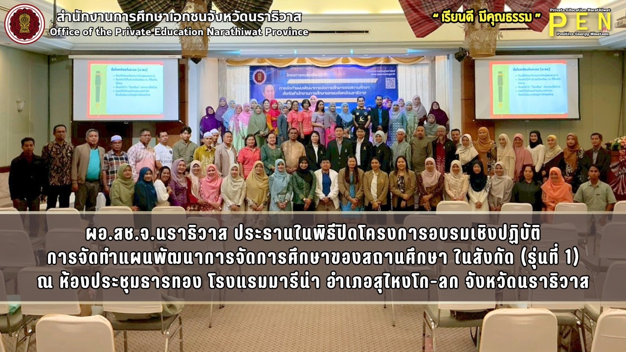 วันที่ 1 ตุลาคม พ.ศ. 2568 เวลา 16:00 น. นายภิญญา รัตนวรชาติ (ผอ.สช.จ.นราธิวาส) ประธานในพิธีปิดโครงการอบรมเชิงปฏิบัติการจัดทำแผนพัฒนาการจัดการศึกษาของสถานศึกษา สังกัดสำนักงานการศึกษาเอกชนจังหวัดนราธิวาส (รุ่นที่ 1) ณ ห้องประชุมธารทอง โรงแรมมารีน่า อำเภอสุไหงโก-ลก จังหวัดนราธิวาส โดยมีวัตถุประสงค์เพื่อร่วมเสริมสร้างความรู้และทักษะในการจัดทำแผนพัฒนาการจัดการศึกษาแก่ผู้บริหารและบุคลากรทางการศึกษา ส่งเสริมการวิเคราะห์ปัญหาความต้องการของสถานศึกษา จัดขึ้นระหว่างวันที่ 29 กันยายน - 1 ตุลาคม 2568 โดยมีกลุ่มเป้าหมายเป็นบุคลากรสำนักงานการศึกษาเอกชนจังหวัดและอำเภอพร้อมด้วย ผู้บริหาร และครูของโรงเรียนเอกชนในสังกัดของ สช.อำเภอ (สุไหงโก-ลก สุไหงปาดี ตากใบ แว้ง และสุคิริน) จำนวนรวมกว่า 100 คน รูปภาพเพิ่มเติม
