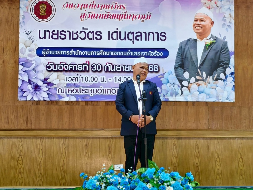 วันที่ 30 กันยายน พ.ศ 2568 สำนักงานการศึกษาเอกชนอำเภอเจาะไอร้อง ร่วมด้วยโรงเรียนเอกชนในระบบและนอกระบบในสังกัด จัดงานมุทิตาจิตแด่นายราชวัตร เด่นตุลาการ ผู้อำนวยการสำนักงานการศึกษาเอกชนอำเภอเจาะไอร้อง ผู้เกษียญอายุราชการ ประจำปี 2568 เพื่อร่วมยกย่องเชิดชูเกียรติแก่ผู้เกษียณอายุราชการที่ได้อุทิศตนปฏิบัติหน้าที่ด้วยความวิริยะ และอุตสาหะ เพื่อการพัฒนาการศึกษาเอกชนในพื้นที่จังหวัดชายแดนภาคใต้อย่างต่อเนื่อง โดยมีนายเอกวิทย์ จันทวงษ์ นายอำเภอเจาะไอร้อง นายภิญญา รัตนวรชาติ ผู้อำนวนการสำนักงานการศึกษาเอกชนจังหวัดนราธิวาส หัวหน้าส่วนราชการ บุคลากรสถานศึกษา คณะครู ประธานและผู้สอนศูนย์การศึกษาอิสลามประจำมัสยิด (ตาดีกา) โต๊ะครูและผู้ช่วยโต๊ะครู สถานบันศึกษาปอเนาะ ร่วมแสดงงานมุทิตาจิตในครั้ง นี้ ณ ห้องประชุมอำเภอเจาะไอร้อง จังหวัดนราธิวาส