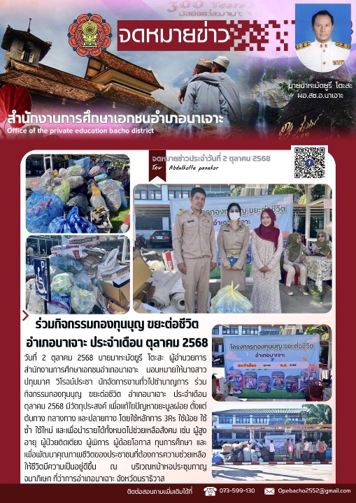วันที่ 2 ตุลาคม 2568 นายมาหะมัดยูรี โตะสะ ผู้อำนวยการสำนักงานการศึกษาเอกชนอำเภอบาเจาะ มอบหมายให้นางสาวปทุมมาศ วิโรจน์ประชา นักจัดการงานทั่วไปชำนาญการ ร่วมกิจกรรมกองทุนบุญ ขยะต่อชีวิต อำเภอบาเจาะ ประจำเดือน ตุลาคม 2568 มีวัตถุประสงค์ เพื่อแก้ไขปัญหาขยะมูลฝอย ตั้งแต่ต้นทาง กลางทาง และปลายทาง โดยใช้หลักการ 3Rs ใช้น้อย ใช้ซ้ำ ใช้ใหม่ เเละเพื่อนำรายได้ทั้งหมดไปช่วยเหลือสังคม เช่น ผู้สูงอายุ ผู้ป่วยติดเตียง ผู้พิการ ผู้ด้อยโอกาส ทุนการศึกษา และเพื่อพัฒนาคุณภาพชีวิตของประชาชนที่ต้องการความช่วยเหลือให้ชีวิตมีความเป็นอยู่ดีขึ้น ณ บริเวณหน้าหอประชุมกาญจนาภิเษก ที่ว่าการอำเภอบาเจาะ จังหวัดนราธิวาส