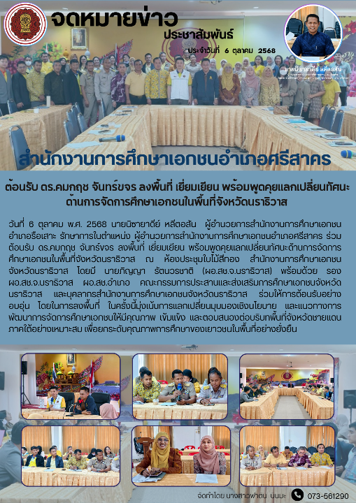 วันที่ 6 ตุลาคม พ.ศ. 2568 นายนิซายาดีย์ หลีตอสัน ผู้อำนวยการสำนักงานการศึกษาเอกชนอำเภอรือเสาะ รักษาการในตำแหน่ง ผู้อำนวยการสำนักงานการศึกษาเอกชนอำเภอศรีสาคร ร่วมต้อนรับ ดร.คมกฤช จันทร์ขจร ลงพื้นที่ เยี่ยมเยียน พร้อมพูดคุยแลกเปลี่ยนทัศนะด้านการจัดการศึกษาเอกชนในพื้นที่จังหวัดนราธิวาส ณ ห้องประชุมใบไม้สีทอง สำนักงานการศึกษาเอกชนจังหวัดนราธิวาส โดยมี นายภิญญา รัตนวรชาติ (ผอ.สช.จ.นราธิวาส) พร้อมด้วย รอง ผอ.สช.จ.นราธิวาส ผอ.สช.อำเภอ คณะกรรมการประสานและส่งเสริมการศึกษาเอกชนจังหวัดนราธิวาส และบุคลากรสำนักงานการศึกษาเอกชนจังหวัดนราธิวาส ร่วมให้การต้อนรับอย่างอบอุ่น โดยในการลงพื้นที่ ในครั้งนี้มุ่งเน้นการแลกเปลี่ยนมุมมองเชิงนโยบาย และแนวทางการพัฒนาการจัดการศึกษาเอกชนให้มีคุณภาพ เข้มแข็ง และตอบสนองต่อบริบทพื้นที่จังหวัดชายแดนภาคใต้อย่างเหมาะสม เพื่อยกระดับคุณภาพการศึกษาของเยาวชนในพื้นที่อย่างยั่งยืน