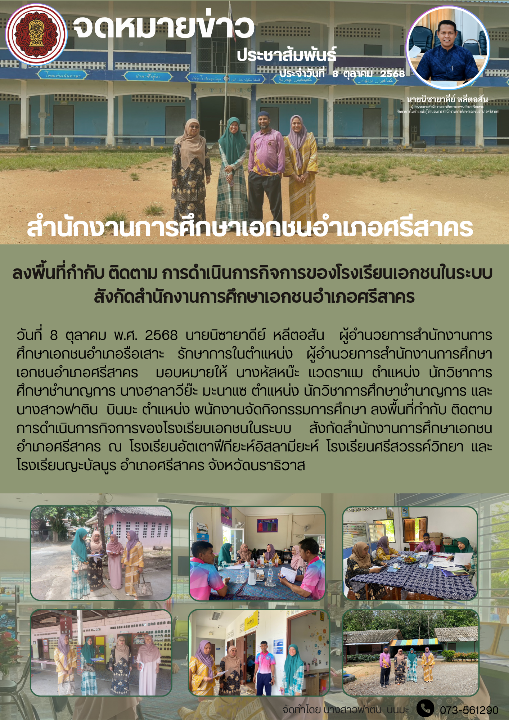 วันที่ 8 ตุลาคม พ.ศ. 2568 นายนิซายาดีย์ หลีตอสัน ผู้อำนวยการสำนักงานการศึกษาเอกชนอำเภอรือเสาะ รักษาการในตำแหน่ง ผู้อำนวยการสำนักงานการศึกษาเอกชนอำเภอศรีสาคร มอบหมายให้ นางหัสหน๊ะ เเวดราเเม ตำเเหน่ง นักวิชาการศึกษาชำนาญการ นางฮาลาวีย๊ะ มะนาแซ ตำแหน่ง นักวิชาการศึกษาชำนาญการ เเละนางสาวฟาติน บินมะ ตำเเหน่ง พนักงานจัดกิจกรรมการศึกษา ลงพื้นที่กำกับ ติดตาม การดำเนินการกิจการของโรงเรียนเอกชนในระบบ สังกัดสำนักงานการศึกษาเอกชนอำเภอศรีสาคร ณ โรงเรียนอัตเตาฟีกียะห์อิสลามียะห์ โรงเรียนศรีสวรรค์วิทยา เเละโรงเรียนญะบัลนูร อำเภอศรีสาคร จังหวัดนราธิวาส