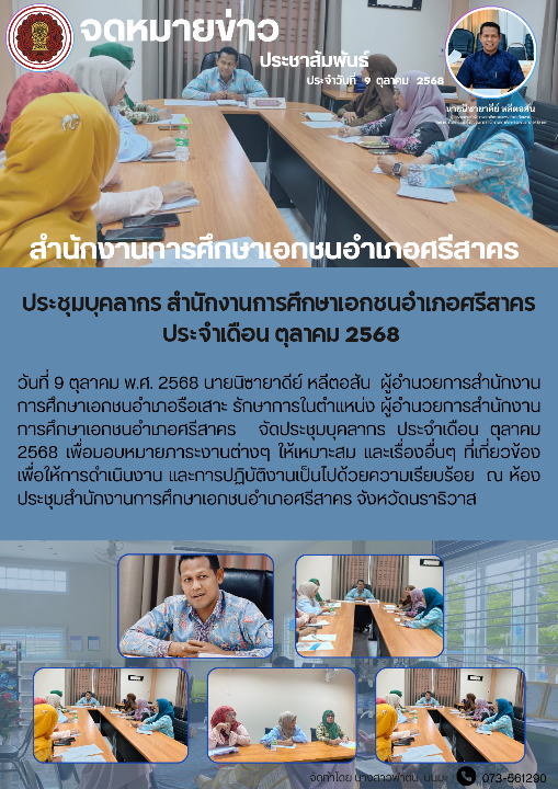 วันที่ 9 ตุลาคม พ.ศ. 2568 นายนิซายาดีย์ หลีตอสัน ผู้อำนวยการสำนักงานการศึกษาเอกชนอำเภอรือเสาะ รักษาการในตำแหน่ง ผู้อำนวยการสำนักงานการศึกษาเอกชนอำเภอศรีสาคร จัดประชุมบุคลากร ประจำเดือน ตุลาคม 2568 เพื่อมอบหมายภาระงานต่างๆ ให้เหมาะสม และเรื่องอื่นๆ ที่เกี่ยวข้อง เพื่อให้การดำเนินงาน และการปฏิบัติงานเป็นไปด้วยความเรียบร้อย ณ ห้องประชุมสำนักงานการศึกษาเอกชนอำเภอศรีสาคร จังหวัดนราธิวาส