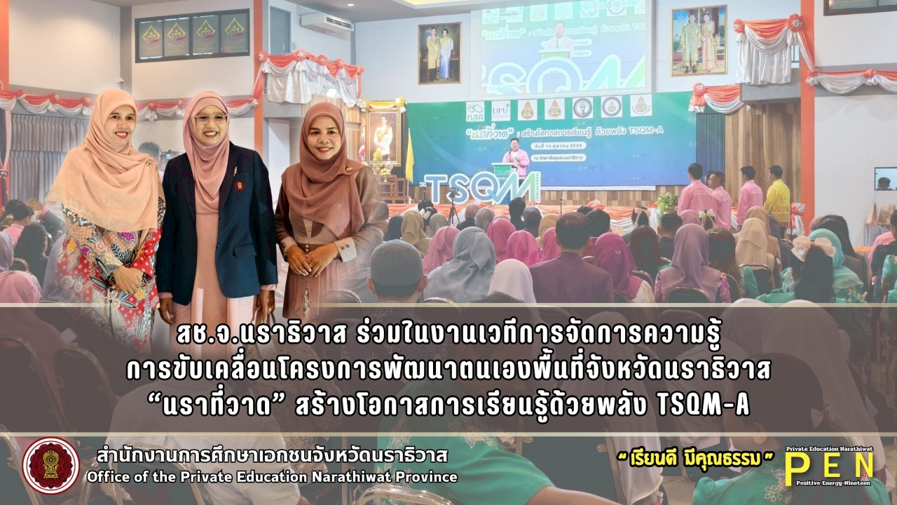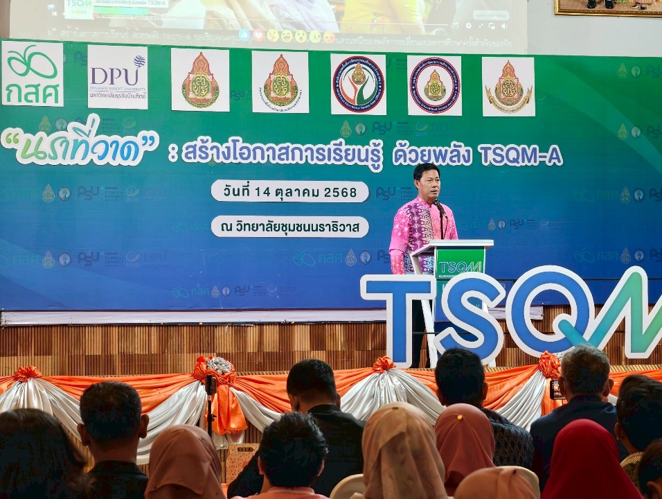 วันที่ 14 ตุลาคม พ.ศ. 2568 เวลา 09:00 น. ดร.กำพล ศรธนะรัตน์ (คณะอนุกรรมการพัฒนาระบบการผลิต พัฒนาครูสำหรับโรงเรียนพื้นที่ห่างไกลและพัฒนาคุณภาพโรงเรียนทั้งระบบ กองทุนเพื่อความเสมอภาคทางการศึกษา (กสศ.)) ประธานในพิธีเปิดงานเวทีการจัดการความรู้ การขับเคลื่อนโครงการพัฒนาตนเองพื้นที่จังหวัดนราธิวาส “นราที่วาด” สร้างโอกาสการเรียนรู้ด้วยพลัง TSQM-A โดยมี นายกฤษณนันท์ กำไร (รองผู้ว่าราชการจังหวัดนราธิวาส) เป็นผู้กล่าวต้อนรับ ณ หอประชุมกระจูด วิทยาลัยชุมชนนราธิวาส อ.เมืองนราธิวาส จ.นราธิวาส ในการนี้ นายภิญญา รัตนวรชาติ (ผอ.สช.จ.นราธิวาส) มอบหมายให้ นางสาววรรณา บินอาสัน (รอง ผอ.สช.จ.นราธิวาส) เข้าร่วมเป็นเกียรติในงาน เพื่อร่วมแลกเปลี่ยนองค์ความรู้ และแนวทางในการขับเคลื่อนการพัฒนาการศึกษาเชิงพื้นที่ สร้างโอกาสการเรียนรู้อย่างเท่าเทียม พร้อมร่วมยกระดับคุณภาพผู้เรียนภายใต้แนวคิด “นราที่วาด” ด้วยพลังความร่วมมือจากหน่วยงานทุกภาคส่วนในจังหวัดนราธิวาส โดยมี ผู้บริหาร หน่วยงานด้านการศึกษา ครู และเจ้าหน้าที่ผู้มีส่วนเกี่ยวข้องร่วมในงาน กว่า 200 คน