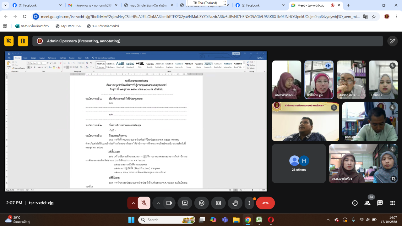 วันที่ 17 เดือนตุลาคม พ.ศ. 2568 นายอับดุลเลาะ กะเด็ง ผู้อำนวยการสำนักงานการศึกษาเอกชนอำเภอระแงะ รักษาการในตำแหน่งผู้อำนวยการสำนักงานการศึกษาเอกชนอำเภอเจาะไอร้อง มอบหมายให้นางสาวซำซิลา สาและ นักวิชาการศึกษาชำนาญการ และนางสาวโรสมาณี ต่วนลอนิ พนักงานปฏิบัติการด้านคอมพิวเตอร์ ร่วมประชุมซักซ้อมสร้างการรับรู้งานกลุ่มแผนงานและยุทธศาสตร์ ผ่านระบบการประชุมออนไลน์ (Google Meet) เพื่อร่วมสร้างความเข้าใจแนวทางการดำเนินงานของกลุ่มแผนงานและยุทธศาสตร์ ให้เป็นไปในทิศทางเดียวกันทั้งในระดับจังหวัดและระดับอำเภอ โดยมีนางสาววรรณา บินอาสัน รองผู้อำนวยการสำนักงานการศึกษาเอกชนจังหวัดนราธิวาส เป็นประธาน ณ สำนักงานการศึกษาเอกชนอำเภอเจาะไอร้อง จังหวัดนราธิวาส