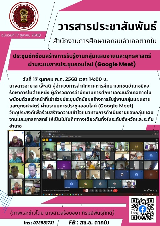 นางสาวอามาล เจ๊ะสนิ ผู้อำนวยการสำนักงานการศึกษาเอกชนอำเภอยี่งอ รักษาการในตำแหน่ง ผู้อำรวยการสำนักงานการศึกษาเอกชนอำเภอตากใบ พน้อมด้วยเจ้าหน้าที่เข้าร่วมประชุมซักซ้อมสร้างการรับรู้งานกลุ่มแผนงานและยุทธศาสตร์ ผ่านระบบการประชุมออนไลน์ (Google Meet) วัตถุประสงค์เพื่อร่วมสร้างความเข้าใจแนวทางการดำเนินงานของกลุ่มแผนงานและยุทธศาสตร์ ให้เป็นไปในทิศทางเดียวกันทั้งในระดับจังหวัดและระดับอำเภอ