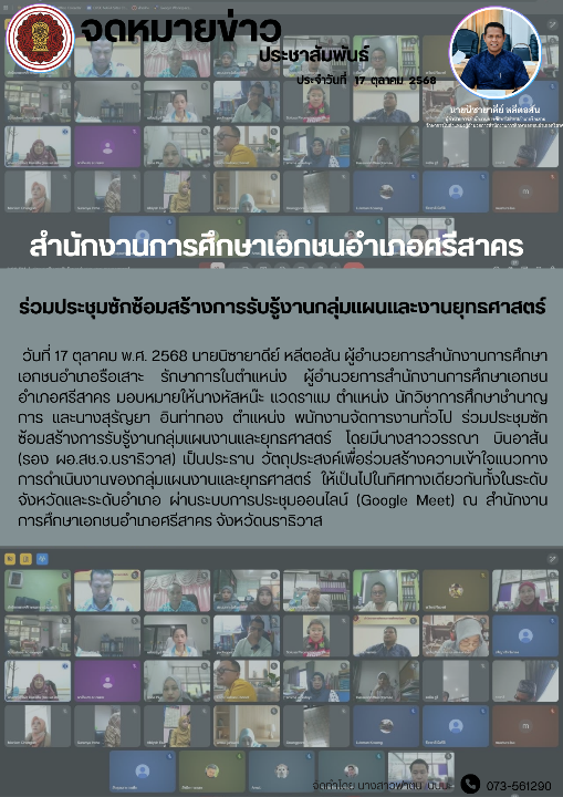 วันที่ 17 ตุลาคม พ.ศ. 2568 นายนิซายาดีย์ หลีตอสัน ผู้อำนวยการสำนักงานการศึกษาเอกชนอำเภอรือเสาะ รักษาการในตำแหน่ง ผู้อำนวยการสำนักงานการศึกษาเอกชนอำเภอศรีสาคร มอบหมายให้นางหัสหน๊ะ เเวดราเเม ตำเเหน่ง นักวิชาการศึกษาชำนาญการ เเละนางสุรัญยา อินท่าทอง ตำเเหน่ง พนักงานจัดการงานทั่วไป ร่วมประชุมซักซ้อมสร้างการรับรู้งานกลุ่มแผนงานและยุทธศาสตร์ โดยมีนางสาววรรณา บินอาสัน (รอง ผอ.สช.จ.นราธิวาส) เป็นประธาน วัตถุประสงค์เพื่อร่วมสร้างความเข้าใจแนวทางการดำเนินงานของกลุ่มแผนงานและยุทธศาสตร์ ให้เป็นไปในทิศทางเดียวกันทั้งในระดับจังหวัดและระดับอำเภอ ผ่านระบบการประชุมออนไลน์ (Google Meet) ณ สำนักงานการศึกษาเอกชนอำเภอศรีสาคร จังหวัดนราธิวาส