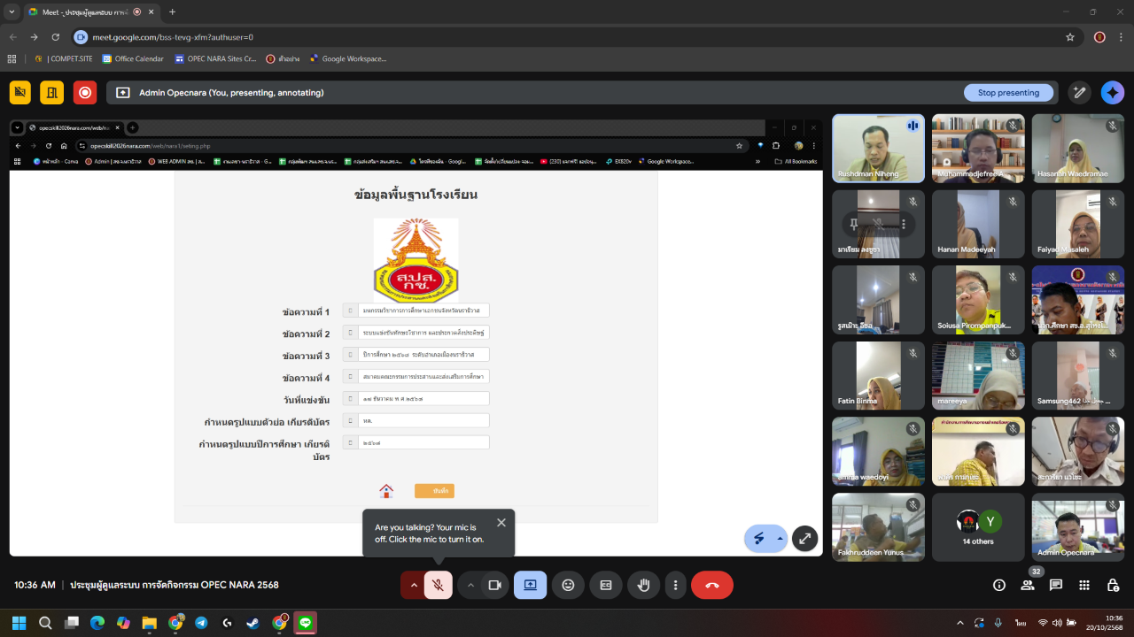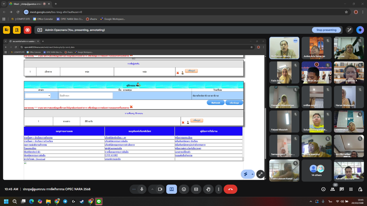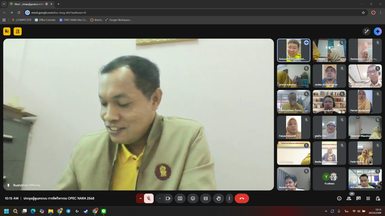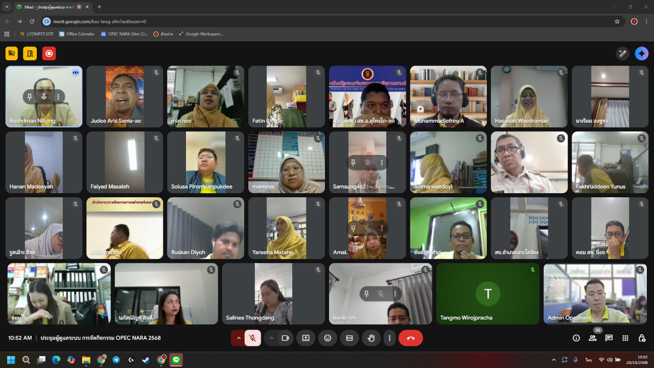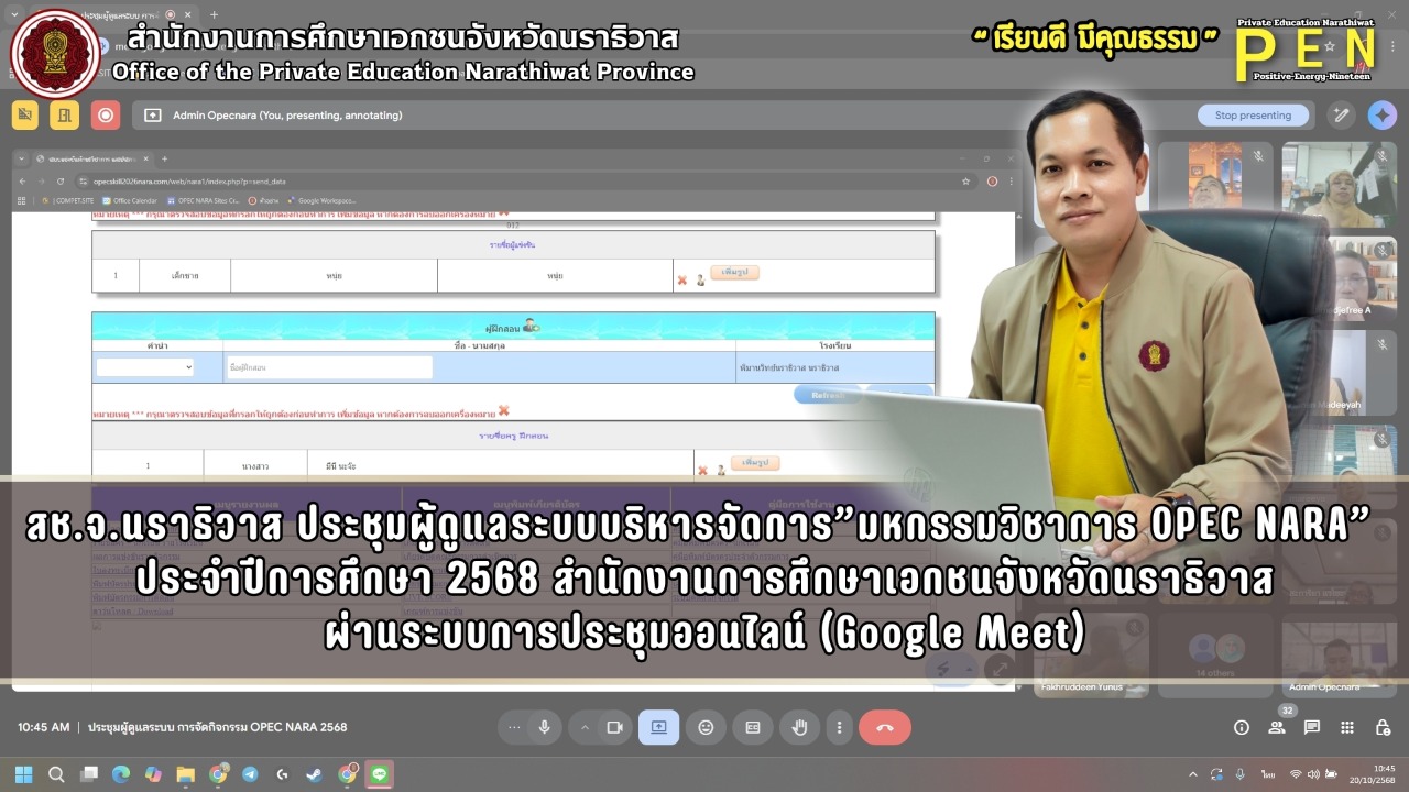 วันที่ 20 ตุลาคม พ.ศ. 2568 เวลา 10:00 น. นายภิญญา รัตนวรชาติ (ผอ.สช.จ.นราธิวาส) มอบหมายให้ นายรุสมาน นิเฮง (รอง ผอ.ส.ช.จ.นราธิวาส) เป็นประธานการประชุมผู้ดูแลระบบบริหารจัดการ มหกรรมวิชาการ OPEC NARA ประจำปีการศึกษา 2568 ผ่านระบบการประชุมออนไลน์ (Google Meet) เพื่อชี้แจงแนวทางการนำระบบบริหารจัดการมาใช้สนับสนุนการดำเนินงานการแข่งขันให้มีความเป็นระบบ เป็นมาตรฐาน และเกิดประสิทธิภาพสูงสุด โดยมีผู้เข้าร่วมประชุมฯ ประกอบด้วย เจ้าหน้าที่ผู้รับผิดชอบงานมหกรรมวิชาการ ในสังกัดสำนักงานการศึกษาเอกชนอำเภอ และเจ้าหน้าที่ผู้รับผิดชอบงานที่เกี่ยวข้อง จำนวนรวม 30 คน