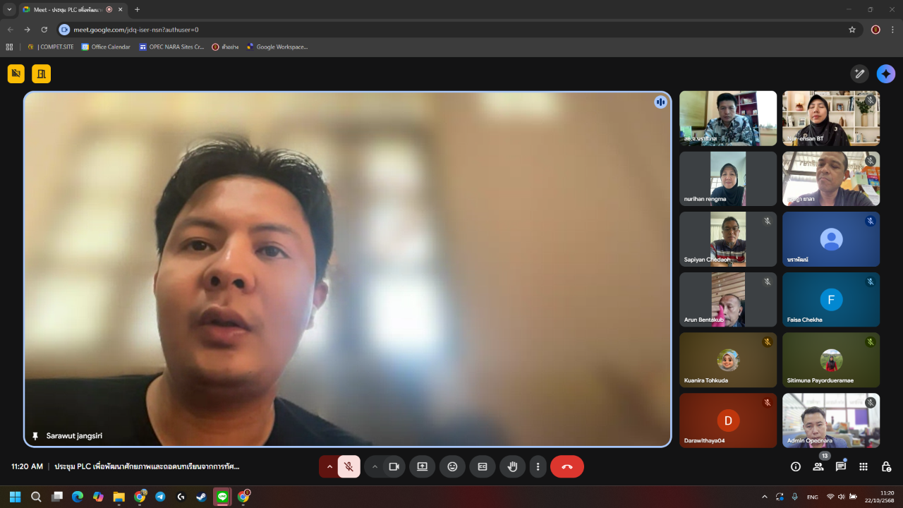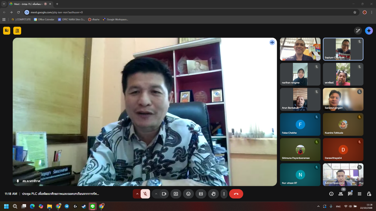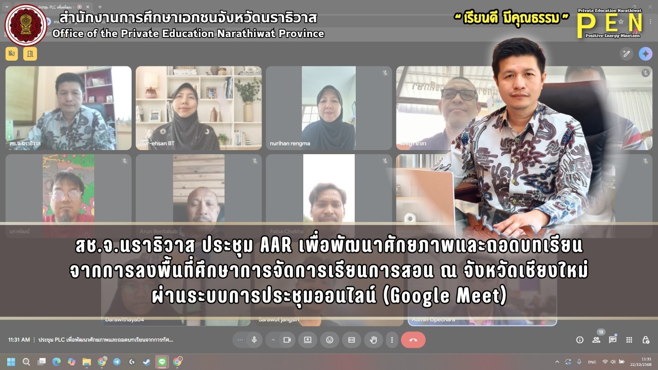 วันที่ 22 ตุลาคม พ.ศ. 2568 เวลา 11:00 น. นายภิญญา รัตนวรชาติ (ผอ.สช.จ.นราธิวาส) ประธานการประชุม AAR เพื่อพัฒนาศักยภาพและถอดบทเรียนจากการลงพื้นที่ศึกษาการจัดการเรียนการสอน ณ โรงเรียนวารีเชียงใหม่ โรงเรียนปลาดาว โรงเรียนปรินส์รอยแยลส์วิทยาลัย และมหาวิทยาลัยเชียงใหม่ เมื่อวันที่ 17-18 กันยายน 2568 ที่ผ่านมา ผ่านระบบการประชุมออนไลน์ (Google Meet) โดยมี ผู้บริหารโรงเรียนเอกชนในสังกัด พร้อมด้วยคณะศึกษาดูงาน เข้าร่วมในการประชุม จำนวนรวม 13 คน เพื่อร่วมแลกเปลี่ยนมุมมอง และองค์ความรู้ที่ได้รับจากการศึกษาดูงาน อันนำไปสู่การพัฒนาการจัดการเรียนการสอนให้มีประสิทธิภาพมากยิ่งขึ้น และสามารถต่อยอดสู่การขับเคลื่อนคุณภาพการศึกษาเอกชนในจังหวัดนราธิวาสได้อย่างเป็นรูปธรรม