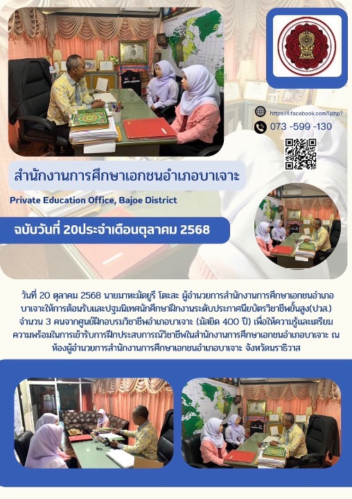 วันที่ 20 ตุลาคม 2568 นายมาหะมัดยูรี โตะสะ ผู้อำนวยการสำนักงานการศึกษาเอกชนอำเภอบาเจาะ ให้การต้อนรับและปฐมนิเทศนักศึกษาฝึกงานระดับประกาศนียบัตรวิชาชีพขั้นสูง (ปวส.) จำนวน 3 คน จากศูนย์ฝึกอบรมวิชาชีพอำเภอบาเจาะ (มัสยิด 400 ปี)เพื่อให้ความรู้และเตรียมความพร้อมในการเข้ารับการฝึกประสบการณ์วิชาชีพในสำนักงานการศึกษาเอกชนอำเภอบาเจาะ ณ ห้องผู้อำนวยการสำนักงานการศึกษาเอกชนอำเภอบาเจาะ จังหวัดนราธิวาส
