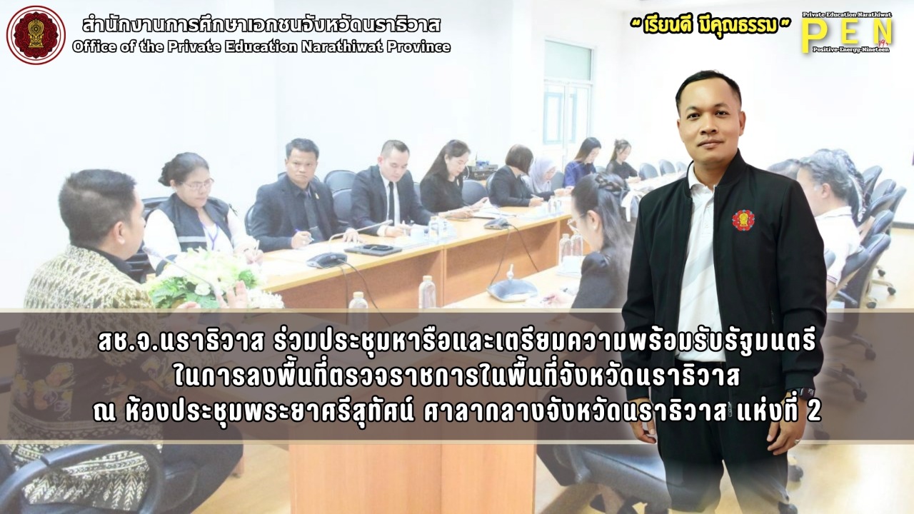วันที่ 5 พฤศจิกายน พ.ศ. 2568 เวลา 13:30 น. นายภิญญา รัตนวรชาติ (ผอ.สช.จ.นราธิวาส) มอบหมายให้ นายรุสมาน นิเฮง (รอง ผอ.สช.จ.นราธิวาส) ร่วมประชุมหารือและเตรียมความพร้อมรับรัฐมนตรีในการลงพื้นที่ตรวจราชการในพื้นที่จังหวัดนราธิวาส ณ ห้องประชุมพระยาศรีสุทัศน์ (ชั้น 4) ศาลากลางจังหวัดนราธิวาส แห่งที่ 2 อ.เมืองนราธิวาส จ.นราธิวาส เพื่อวางแนวทางการดำเนินงานด้านความพร้อมของหน่วยงาน รวมถึงการประสานงานด้านข้อมูล และกำหนดการลงพื้นที่ตรวจราชการของคณะรัฐมนตรี ในระหว่างวันที่ 7-10 พฤศจิกายน 2568 ให้เป็นไปด้วยความเรียบร้อย โดยในการนี้มี ดร.ชาร์รีฟท์ สือนิ (ศึกษาธิการจังหวัดนราธิวาส) เป็นประธานในการประชุม