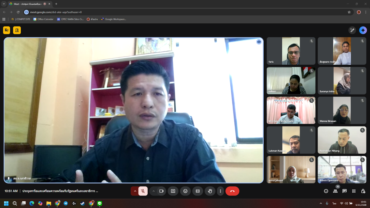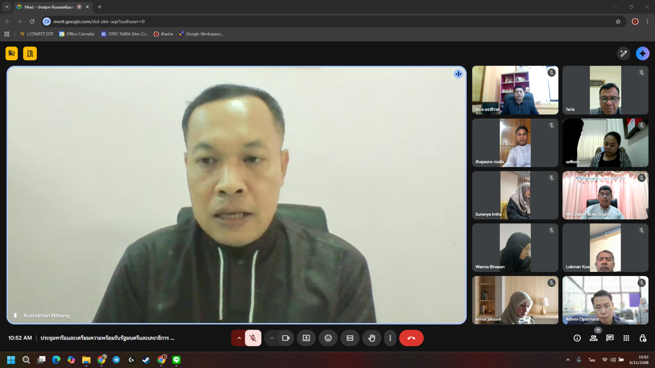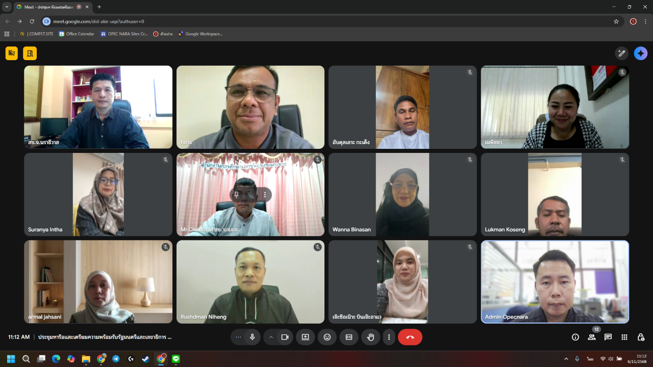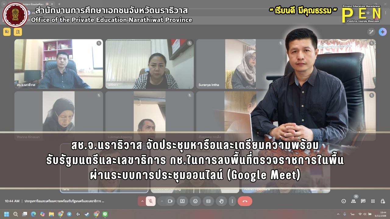 วันที่ 6 พฤศจิกายน พ.ศ. 2568 เวลา 10:30 น. นายภิญญา รัตนวรชาติ (ผอ.สช.จ.นราธิวาส) ประธานการประชุมหารือและเตรียมความพร้อมรับรัฐมนตรีและเลขาธิการ กช. ในการลงพื้นที่ตรวจราชการในพื้นที่จังหวัดนราธิวาส ผ่านระบบการประชุมออนไลน์ (Google Meet) เพื่อเตรียมความพร้อมของหน่วยงานในการต้อนรับรัฐมนตรีว่าการกระทรวงศึกษาธิการและเลขาธิการ กช. ซึ่งมีกำหนดลงพื้นที่ในวันที่ 7-10 พฤศจิกายน 2568 ให้เป็นไปด้วยความเรียบร้อย โดยมี รอง ผอ.สช.จ.นราธิวาส ผอ.สช.อำเภอ/ผู้แทน และเจ้าหน้าที่ผู้เกี่ยวข้องอื่นๆ ร่วมในการประชุม จำนวนรวม 12 คน