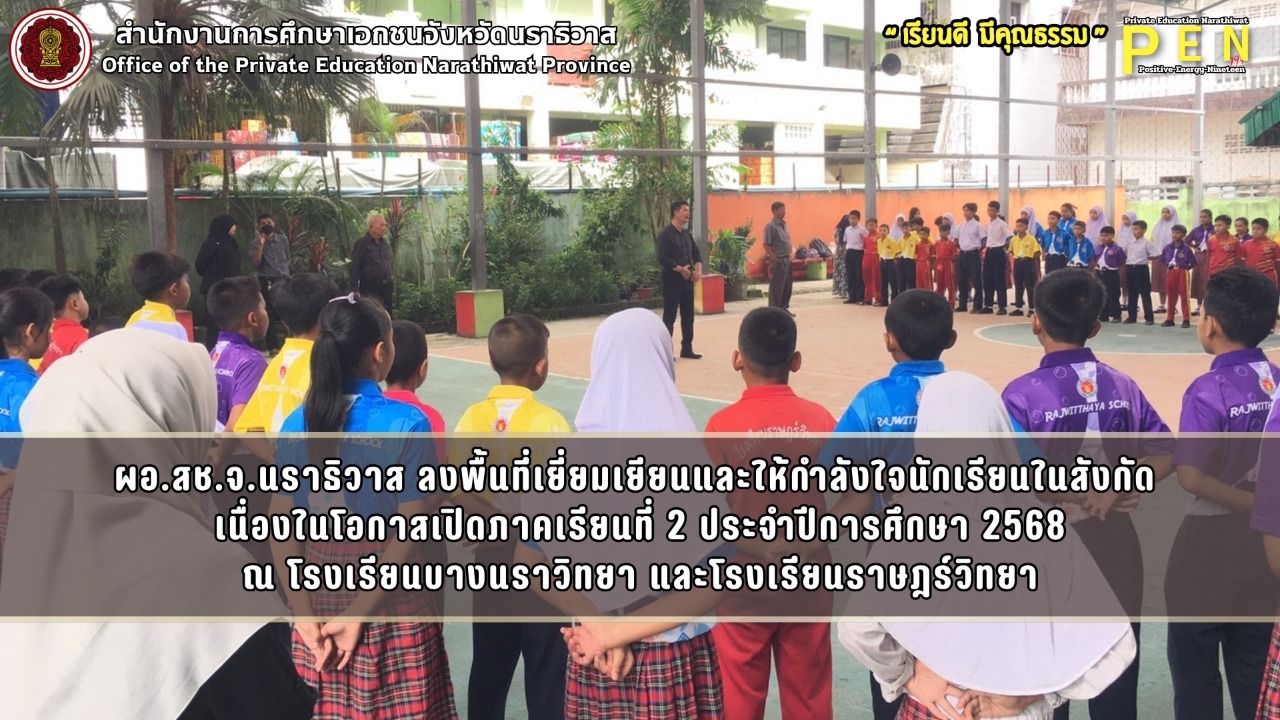 ผอ.สช.จ.นราธิวาส ลงพื้นที่เยี่ยมเยียนและให้กำลังใจนักเรียนในสังกัด เนื่องในโอกาสเปิดภาคเรียนที่ 2 ประจำปีการศึกษา 2568 ณ โรงเรียนบางนราวิทยา และโรงเรียนราษฎร์วิทยา