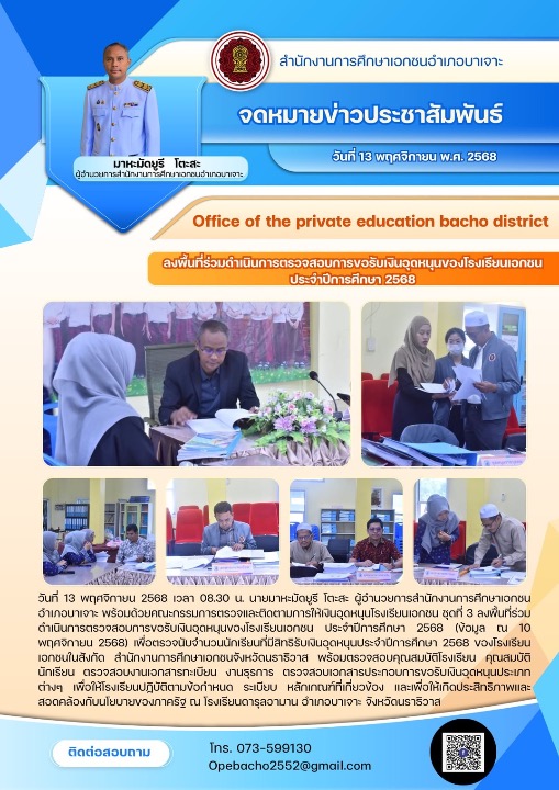 วันที่ 13 พฤศจิกายน 2568 เวลา 08.30 น. นายมาหะมัดยูรี โตะสะ ผู้อำนวยการสำนักงานการศึกษาเอกชนอำเภอบาเจาะ พร้อมด้วยคณะกรรมการตรวจและติดตามการให้เงินอุดหนุนโรงเรียนเอกชน ชุดที่ 3 ลงพื้นที่ร่วมดำเนินการตรวจสอบการขอรับเงินอุดหนุนของโรงเรียนเอกชน ประจำปีการศึกษา 2568 (ข้อมูล ณ 10 พฤศจิกายน 2568) เพื่อตรวจนับจำนวนนักเรียนที่มีสิทธิรับเงินอุดหนุนประจำปีการศึกษา 2568 ของโรงเรียนเอกชนในสังกัด สำนักงานการศึกษาเอกชนจังหวัดนราธิวาส พร้อมตรวจสอบคุณสมบัติโรงเรียน คุณสมบัตินักเรียน ตรวจสอบงานเอกสารทะเบียน งานธุรการ ตรวจสอบเอกสารประกอบการขอรับเงินอุดหนุนประเภทต่างๆ เพื่อให้โรงเรียนปฏิบัติตามข้อกำหนด ระเบียบ หลักเกณฑ์ที่เกี่ยวข้อง และเพื่อให้เกิดประสิทธิภาพและสอดคล้องกับนโยบายของภาครัฐ ณ โรงเรียนดารุลอามาน อำเภอบาเจาะ จังหวัดนราธิวาส