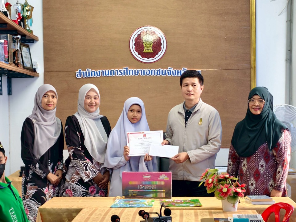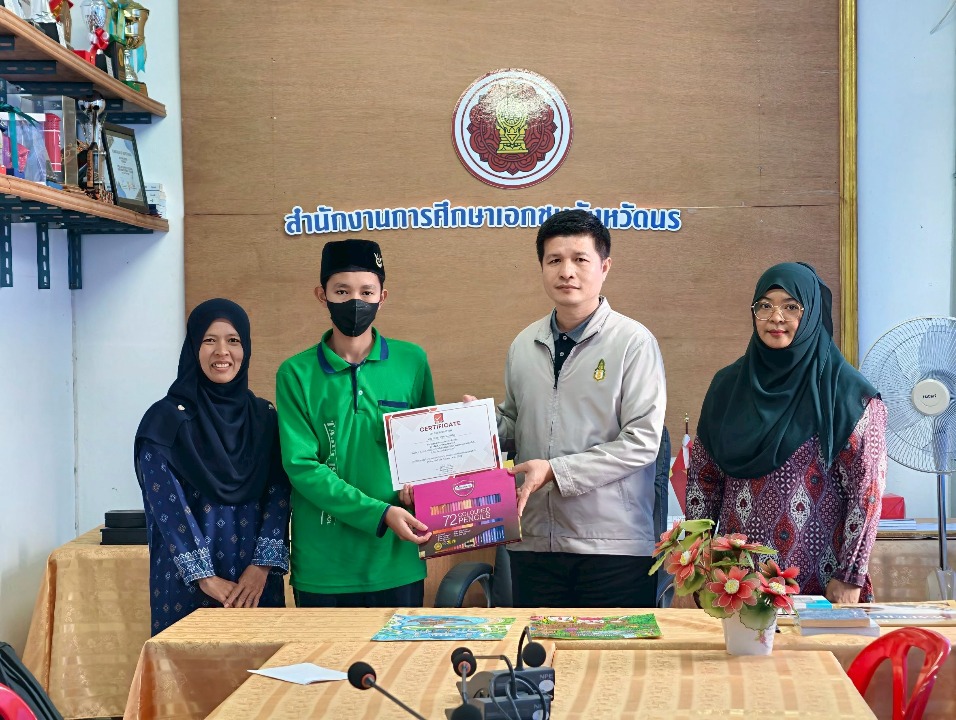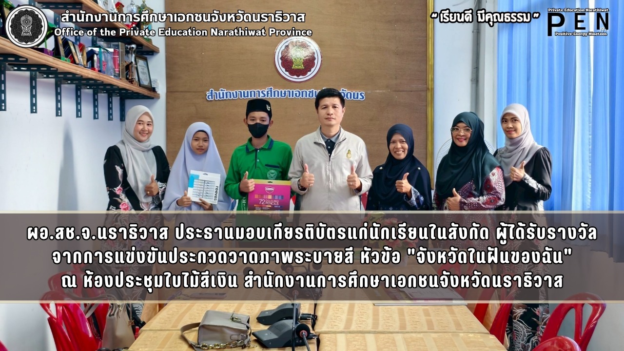 ผอ.สช.จ.นราธิวาส ประธานมอบเกียรติบัตรแก่นักเรียนในสังกัด ผู้ได้รับรางวัล จากการแข่งขันประกวดวาดภาพระบายสี หัวข้อ "จังหวัดในฝันของฉัน"