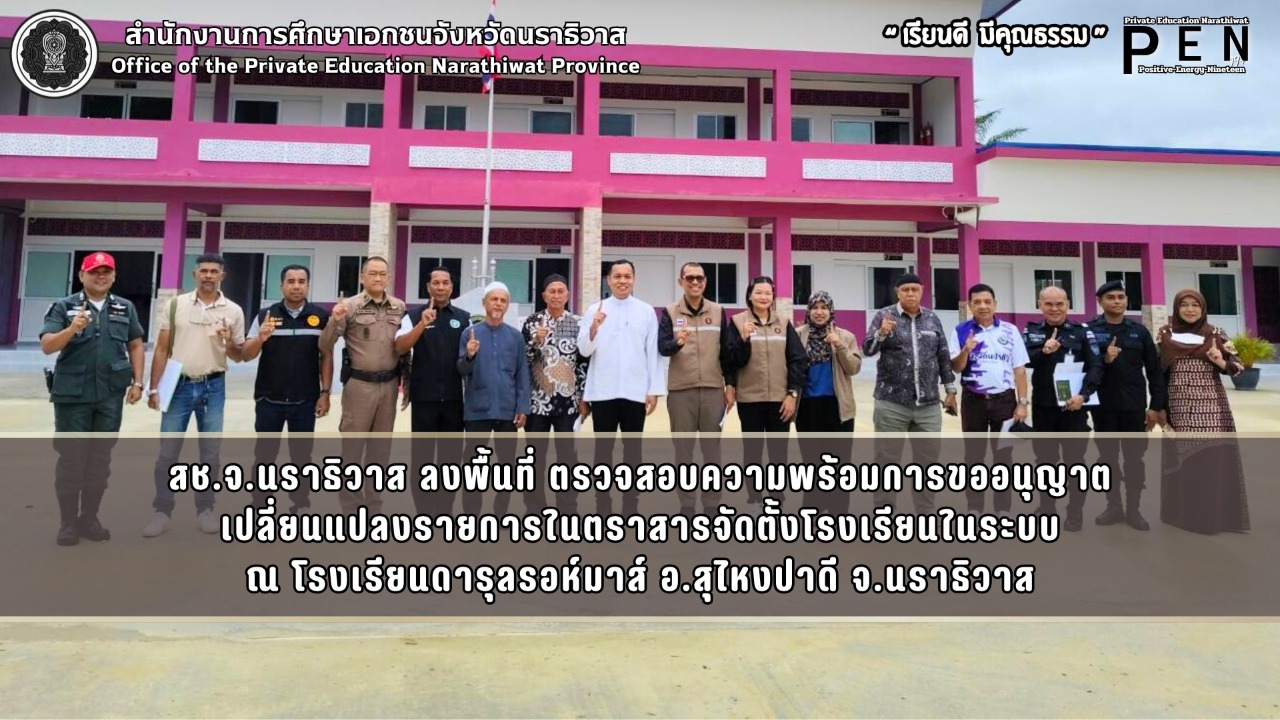 วันที่ 20 พฤศจิกายน พ.ศ. 2568 เวลา 09:30 น. นายภิญญา รัตนวรชาติ (ผอ.สช.จ.นราธิวาส) มอบหมายให้ นายรุสมาน นิเฮง (รอง ผอ.สช.จ.นราธิวาส) พร้อมด้วย คณะกรรมการตรวจสอบความพร้อมการขออนุญาตเปลี่ยนแปลงรายการในตราสารจัดตั้งโรงเรียนในระบบ ร่วมลงพื้นที่ ตรวจสอบความพร้อมการขออนุญาตเปลี่ยนแปลงรายการในตราสารจัดตั้งของโรงเรียน ณ โรงเรียนดารุลรอห์มาส์ อ.สุไหงปาดี จ.นราธิวาส เนื่องจากประสงค์ขออนุญาตขยายความจุนักเรียน และขออนุญาตใช้อาคารเรียนเพิ่มเติม เพื่อประโยชน์ในการจัดการเรียนการสอนในปีการศึกษา 2569 โดยมี ผู้รับใบอนุญาต ผู้บริหาร และคณะครู ร่วมให้การต้อนรับเป็นอย่างดี