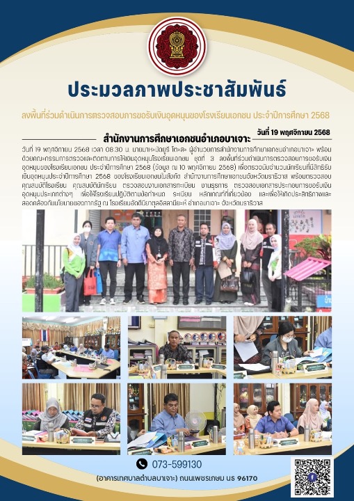 วันที่ 19 พฤศจิกายน 2568 เวลา 08.30 น. นายมาหะมัดยูรี โตะสะ ผู้อำนวยการสำนักงานการศึกษาเอกชนอำเภอบาเจาะ พร้อมด้วยคณะกรรมการตรวจและติดตามการให้เงินอุดหนุนโรงเรียนเอกชน ชุดที่ 3 ลงพื้นที่ร่วมดำเนินการตรวจสอบการขอรับเงินอุดหนุนของโรงเรียนเอกชน ประจำปีการศึกษา 2568 (ข้อมูล ณ 10 พฤศจิกายน 2568) เพื่อตรวจนับจำนวนนักเรียนที่มีสิทธิรับเงินอุดหนุนประจำปีการศึกษา 2568 ของโรงเรียนเอกชนในสังกัด สำนักงานการศึกษาเอกชนจังหวัดนราธิวาส พร้อมตรวจสอบคุณสมบัติโรงเรียน คุณสมบัตินักเรียน ตรวจสอบงานเอกสารทะเบียน งานธุรการ ตรวจสอบเอกสารประกอบการขอรับเงินอุดหนุนประเภทต่างๆ เพื่อให้โรงเรียนปฏิบัติตามข้อกำหนด ระเบียบ หลักเกณฑ์ที่เกี่ยวข้อง และเพื่อให้เกิดประสิทธิภาพและสอดคล้องกับนโยบายของภาครัฐ ณ โรงเรียนอัดดีนียาตุลอิสลามียะห์ อำเภอบาเจาะ จังหวัดนราธิวาส