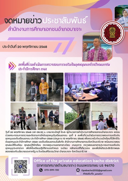 วันที่ 20 พฤศจิกายน 2568 เวลา 08.30 น. นายมาหะมัดยูรี โตะสะ ผู้อำนวยการสำนักงานการศึกษาเอกชนอำเภอบาเจาะ พร้อมด้วยคณะกรรมการตรวจและติดตามการให้เงินอุดหนุนโรงเรียนเอกชน ชุดที่ 3 ลงพื้นที่ร่วมดำเนินการตรวจสอบการขอรับเงินอุดหนุนของโรงเรียนเอกชน ประจำปีการศึกษา 2568 (ข้อมูล ณ 10 พฤศจิกายน 2568) เพื่อตรวจนับจำนวนนักเรียนที่มีสิทธิรับเงินอุดหนุนประจำปีการศึกษา 2568 ของโรงเรียนเอกชนในสังกัด สำนักงานการศึกษาเอกชนจังหวัดนราธิวาส พร้อมตรวจสอบคุณสมบัติโรงเรียน คุณสมบัตินักเรียน ตรวจสอบงานเอกสารทะเบียน งานธุรการ ตรวจสอบเอกสารประกอบการขอรับเงินอุดหนุนประเภทต่างๆ เพื่อให้โรงเรียนปฏิบัติตามข้อกำหนด ระเบียบ หลักเกณฑ์ที่เกี่ยวข้อง และเพื่อให้เกิดประสิทธิภาพและสอดคล้องกับนโยบายของภาครัฐ ณ โรงเรียนศิริธรรมวิทยา อำเภอบาเจาะ จังหวัดนราธิวาส