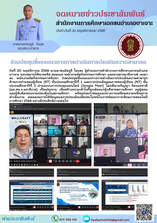 วันที่ 20 พฤศจิกายน 2568 นายมาหะมัดยูรี โตะสะ ผู้อำนวยการสำนักงานการศึกษาเอกชนอำเภอบาเจาะ มอบหมายให้นายอริส สะมะแอ พนักงานจัดกิจกรรมการศึกษา และนางสาวนาซีเราะห์ เจะมามะ พนักงานจัดกิจกรรมการศึกษา ร่วมประชุมชี้แจงแนวทางการดำเนินการประเมินความสามารถด้านการอ่านของผู้เรียน (RT) ชั้นประถมศึกษาปีที่ 1 และการประเมินคุณภาพของผู้เรียน (NT) ชั้นประถมศึกษาปีที่ 3 ผ่านระบบการประชุมออนไลน์ (Google Meet) โดยมีนายภิญญา รัตนวรชาติ (ผอ.สช.จ.นราธิวาส) เป็นประธาน เพื่อสร้างความเข้าใจที่ถูกต้องแก่ผู้บริหารสถานศึกษา ครูผู้สอน และผู้รับผิดชอบงานประเมินในสถานศึกษา พร้อมร่วมกำหนดแนวทางการเตรียมความพร้อมการดำเนินงาน ตลอดจนการใช้ข้อมูลผลการประเมินเพื่อประโยชน์ในการพัฒนาการเรียนการสอนในปีการศึกษา 2568 อย่างมีประสิทธิภาพต่อไป