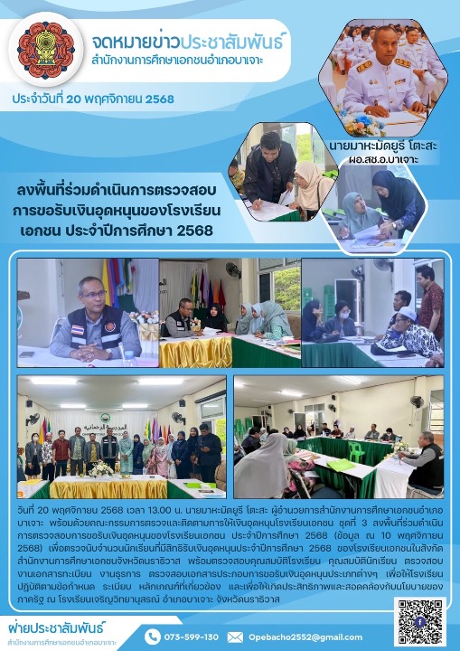 วันที่ 20 พฤศจิกายน 2568 เวลา 13.00 น. นายมาหะมัดยูรี โตะสะ ผู้อำนวยการสำนักงานการศึกษาเอกชนอำเภอบาเจาะ พร้อมด้วยคณะกรรมการตรวจและติดตามการให้เงินอุดหนุนโรงเรียนเอกชน ชุดที่ 3 ลงพื้นที่ร่วมดำเนินการตรวจสอบการขอรับเงินอุดหนุนของโรงเรียนเอกชน ประจำปีการศึกษา 2568 (ข้อมูล ณ 10 พฤศจิกายน 2568) เพื่อตรวจนับจำนวนนักเรียนที่มีสิทธิรับเงินอุดหนุนประจำปีการศึกษา 2568 ของโรงเรียนเอกชนในสังกัด สำนักงานการศึกษาเอกชนจังหวัดนราธิวาส พร้อมตรวจสอบคุณสมบัติโรงเรียน คุณสมบัตินักเรียน ตรวจสอบงานเอกสารทะเบียน งานธุรการ ตรวจสอบเอกสารประกอบการขอรับเงินอุดหนุนประเภทต่างๆ เพื่อให้โรงเรียนปฏิบัติตามข้อกำหนด ระเบียบ หลักเกณฑ์ที่เกี่ยวข้อง และเพื่อให้เกิดประสิทธิภาพและสอดคล้องกับนโยบายของภาครัฐ ณ โรงเรียนเจริญวิทยานุสรณ์ อำเภอบาเจาะ จังหวัดนราธิวาส