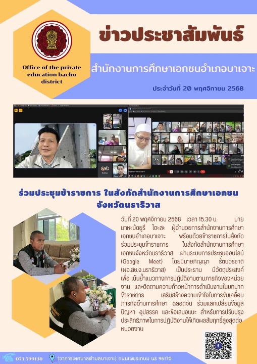 วันที่ 20 พฤศจิกายน 2568 เวลา 15.30 น. นายมาหะมัดยูรี โตะสะ ผู้อำนวยการสำนักงานการศึกษาเอกชนอำเภอบาเจาะ พร้อมด้วยข้าราชการในสังกัด ร่วมประชุมข้าราชการในสังกัดสำนักงานการศึกษาเอกชนจังหวัดนราธิวาส ผ่านระบบการประชุมออนไลน์ (Google Meet) โดยมีนายภิญญา รัตนวรชาติ (ผอ.สช.จ.นราธิวาส) เป็นประธาน มีวัตถุประสงค์เพื่อเน้นย้ำแนวทางการปฏิบัติงานตามภารกิจของหน่วยงาน และติดตามความก้าวหน้าการดำเนินงานในบทบาทข้าราชการ เสริมสร้างความเข้าใจในการขับเคลื่อนภารกิจด้านการศึกษา ตลอดจน ร่วมแลกเปลี่ยนข้อมูล ปัญหา อุปสรรค และข้อเสนอแนะ สำหรับการปรับปรุงประสิทธิภาพในการปฏิบัติงานให้เกิดผลสัมฤทธิ์สูงสุดต่อหน่วยงาน