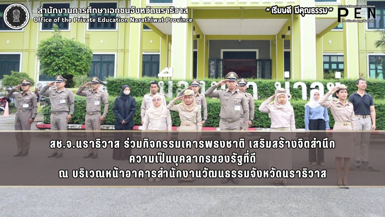วันที่ 29 ธันวาคม พ.ศ. 2568 เวลา 08:00 น. นายภิญญา รัตนวรชาติ (ผอ.สช.จ.นราธิวาส) มอบหมายให้ บุคลากรสำนักงานการศึกษาเอกชนจังหวัดนราธิวาส ร่วมกิจกรรมเคารพธงชาติ ณ บริเวณหน้าอาคารสำนักงานวัฒนธรรมจังหวัดนราธิวาส เพื่อร่วมแสดงออกถึงความจงรักภักดีต่อ “สถาบันชาติ ศาสนา พระมหากษัตริย์” และเป็นการเสริมสร้างความสามัคคีหมู่ข้าราชการ ตลอดจนร่วมปลูกฝังจิตสำนึกที่ดี ในการปฏิบัติหน้าที่ของข้าราชการและบุคลากรภาครัฐ