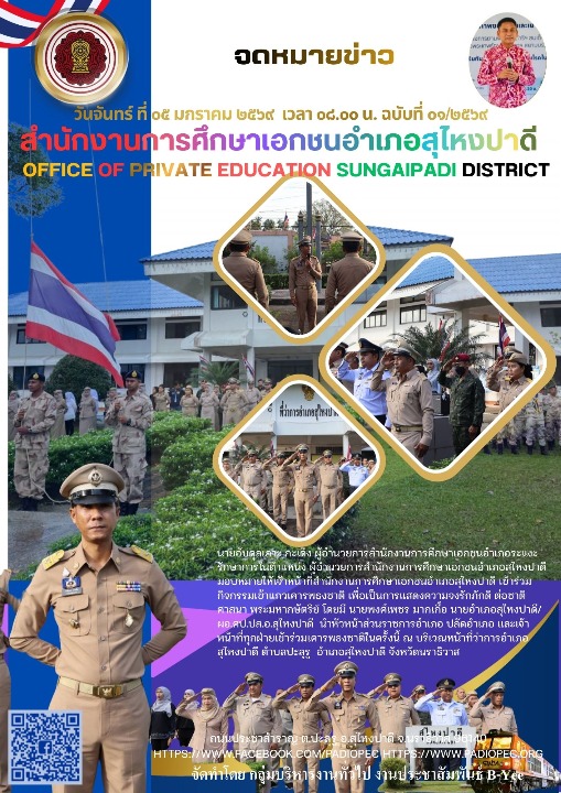 นายอับดุลเลาะ กะเด็ง ผู้อำนวยการสำนักงานการศึกษาเอกชนอำเภอระแงะ รักษาการในตำแหน่ง ผู้อำนวยการสำนักงานการศึกษาเอกชนอำเภอสุไหงปาดี มอบหมายให้เจ้าหน้าที่สำนักงานการศึกษาเอกชนอำเภอสุไหงปาดี ร่วมกิจกรรมเข้าแถวเคารพธงชาติ และร้องเพลงชาติไทย ทุกวันจันทร์ของสัปดาห์ เพื่อเป็นการแสดงออกถึงความจงรักภักดีต่อสถาบัน ชาติ ศาสนา พระมหากษัตริย์ พร้อมทั้งร่วมสวดมนต์ไหว้พระ กล่าวดูอาฮ์ เพื่อความเป็นสิริมงคลในการปฏิบัติราชการ ทั้งนี้ได้พบปะผู้เข้าร่วมกิจกรรมฯ เพื่อประชาสัมพันธ์ข้อราชการ และภารกิจสำคัญ ให้ส่วนราชการได้รับทราบ โดยมีนายพงศ์เพชร มากเกื้อ นายอำเภอสุไหงปาดี/ผอ.ศปก.อ.สุไหงปาดี นำหัวหน้าส่วนราชการ ปลัดอำเภอ เสมียนตราอำเภอ เจ้าหน้าที่ปกครอง พนักงานราชการ ลูกจ้าง และสมาชิก อส.อ.สุไหงปาดี ณ บริเวณหน้าเสาธง ที่ว่าการอำเภอสุไหงปาดี จังหวัดนราธิวาส