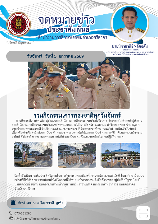 วันจันทร์ วันที่ 5 มกราคม 2569 นายนิซายาดีย์ หลีตอสัน ผู้อำนวยการสำนักงานการศึกษาเอกชนอำเภอรือเสาะ รักษาการในตำแหน่งผู้อำนวยการสำนักงานการศึกษาเอกชนอำเภอศรีสาคร มอบหมายให้ นางหัสหน๊ะ แวดราแม นักวิชาการศึกษาชำนาญการ ร่วมเข้าแถวเคารพธงชาติ ร่วมกิจกรรมเข้าแถวเคารพธงชาติ ร้องเพลงชาติไทย ก่อนเข้าทำงานในเช้าวันจันทร์ เพื่อเสริมสร้างจิตสำนึกต่อสถาบันชาติ ศาสนา พระมหากษัตริย์และการเป็นข้าราชการที่ดี เพื่อแสดงออกถึงความจงรักภักดีต่อชาติ ศาสนาและพระมหากษัตริย์ และเป็นการเตรียมความพร้อมในการปฏิบัติราชการ อีกทั้งยังเป็นการเพิ่มประสิทธิภาพในการทำงาน และเสริมสร้างความรัก ความสามัคคี ในองค์กร เป็นแบบอย่างที่ดีให้กับประชาชนโดยทั่วไป โอกาสนี้ได้พบปะข้าราชการแจ้งข้อสั่งการของผู้บังคับบัญชา โดยมีนายศุภวัฒน์ ชูรัตน์ ปลัดอำเภอหัวหน้ากลุ่มงานบริหารงานปกครองณ หน้าที่ว่าการอำเภอศรีสาคร จังหวัดนราธิวาส