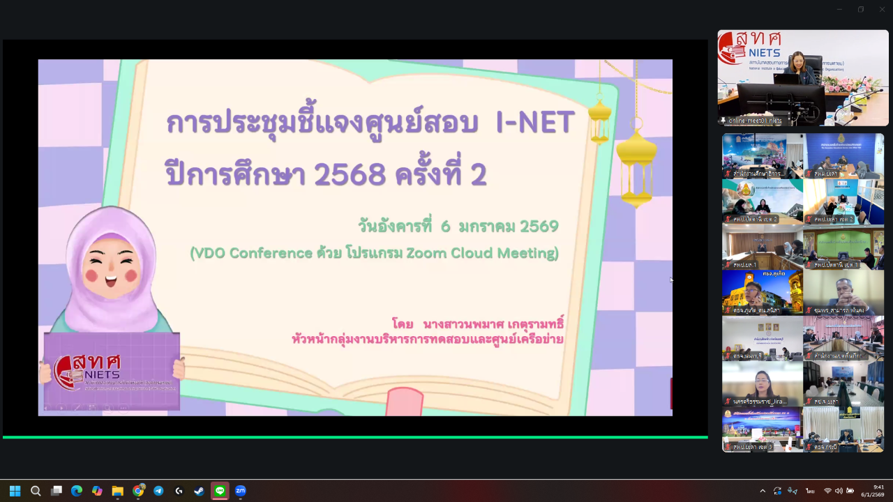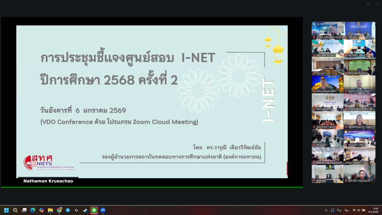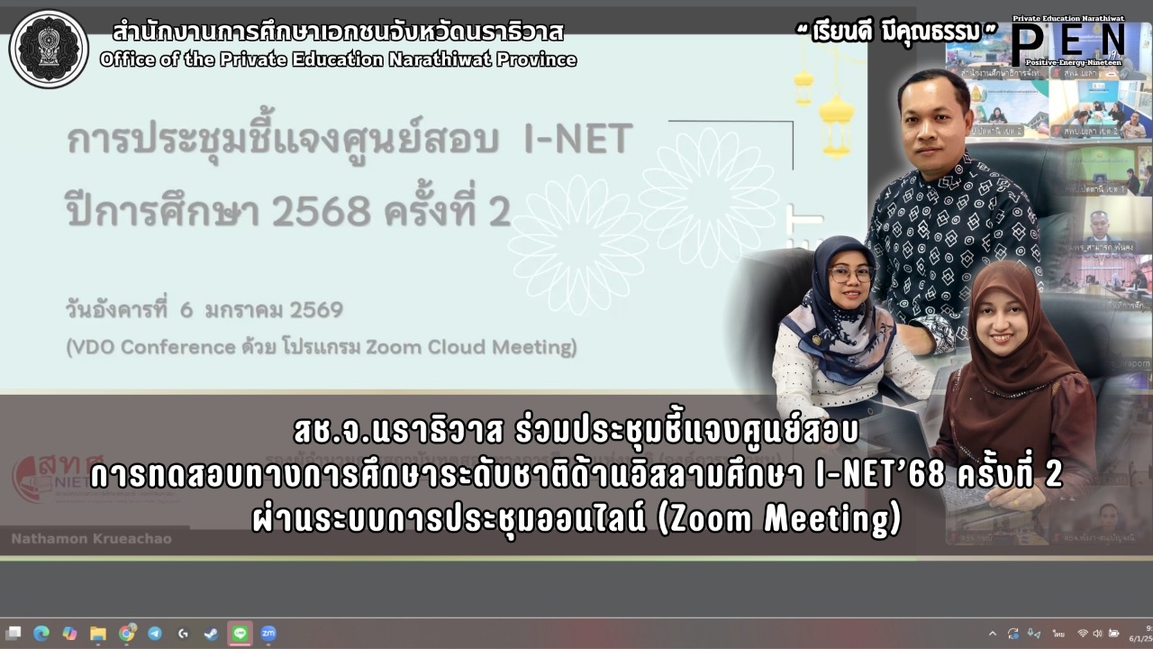 นายภิญญา รัตนวรชาติ (ผอ.สช.จ.นราธิวาส) มอบหมายให้ นายรุสมาน นิเฮง (รอง ผอ.สช.จ.นราธิวาส) พร้อมด้วย นางสาวซูรียานี อูเซ็ง (พนักงานจัดกิจกรรมการศึกษา) และ นางอีดาวาตี อาบู (พนักงานจัดกิจกรรมการศึกษา) ร่วมในการประชุมชี้แจงศูนย์สอบการทดสอบทางการศึกษาระดับชาติด้านอิสลามศึกษา I-NET ปีการศึกษา 2568 ครั้งที่ 2 จัดขึ้นโดย สถาบันทดสอบทางการศึกษาแห่งชาติ (องค์การมหาชน) ผ่านระบบการประชุมออนไลน์ (Zoom Meeting) เพื่อร่วมสร้างความเข้าใจในแนวทางการดำเนินงาน และการบริหารจัดการศูนย์สอบให้เป็นไปอย่างเรียบร้อย อย่างมีประสิทธิภาพ และเป็นไปตามมาตรฐานของการทดสอบทางการศึกษาแห่งชาติอย่างเคร่งครัด โดยมี ผศ.ดร.ศิริดา บุรชาติ (ผอ.สทศ.) เป็นประธานเปิดการประชุม