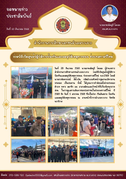 วันที่ 30 ธันวาคม 2568 นายมาหะมัดยูรี โตะสะ ผู้อำนวยการสำนักงานการศึกษาเอกชนอำเภอบาเจาะ ร่วมพิธีเปิดศูนย์ปฏิบัติการป้องกันและลดอุบัติเหตุทางถนน ช่วงเทศกาลปีใหม่ พ.ศ.2569 โดยมีนางสาวพิมพาภรณ์ สีน้ำเงิน ปลัดอำเภอหัวหน้ากลุ่มงานบริหารงานปกครอง เป็นประธาน ทั้งนี้ ได้บูรณาการกำลังพลทั้งฝ่ายปกครอง ตำรวจ ทหาร สมาชิก อส. อาสาสมัครและเจ้าหน้าที่ที่เกี่ยวข้องทุกภาคส่วน ในการดูแลการเดินทางของประชาชนในช่วงเทศกาลปีใหม่ ปี 2569 ถึง วันที่ 5 มกราคม 2569 ซึ่งเป็นช่วง 7วันอันตราย ป้องกันและลดอุบัติเหตุทางถนน ณ ลานหน้าที่ว่าการอำเภอบาเจาะ จังหวัดนราธิวาส