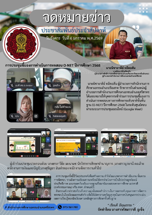 วันอังคาร วันที่ 6 มกราคม พ.ศ.2569 นายนิซายาดีย์ หลีตอสัน ผู้อำนวยการสำนักงานการศึกษาเอกชนอำเภอรือเสาะ รักษาการในตำแหน่งผู้อำนวยการสำนักงานการศึกษาเอกชนอำเภอศรีสาคร ได้มอบหมายให้บุคลากรเข้าร่วมการประชุมชี้แจงการดำเนินการทดสอบทางการศึกษาระดับชาติขั้นพื้นฐาน (O-NET) ปีการศึกษา 2568 ในระดับศูนย์สอบ ผ่านระบบการประชุมออนไลน์ (Google Meet) ผู้เข้าร่วมประชุมประกอบด้วย นางฮาลาวีย๊ะ มะนาแซ นักวิชาการศึกษาชำนาญการ ,นางสาวนูรยานี ดอเล๊าะ พนักงานการเงินและบัญชี,นางสุรัญยา อินท่าทอง พนักงานจัดการงานทั่วไป การประชุมครั้งนี้มีวัตถุประสงค์เพื่อสร้างความเข้าใจในแนวทางการดำเนินงาน ขั้นตอนการจัดสอบ รวมถึงการเตรียมความพร้อมให้การดำเนินการเป็นไปอย่างถูกต้อง มีประสิทธิภาพ และสอดคล้องกับมาตรฐานที่สถาบันทดสอบทางการศึกษาแห่งชาติ (องค์การมหาชน) หรือ สทศ. กำหนดไว้ กิจกรรมดังกล่าวสะท้อนถึงความมุ่งมั่นของสำนักงานในการยกระดับคุณภาพการจัดการทดสอบในโรงเรียนเอกชนสังกัด เพื่อให้เกิดความพร้อมสูงสุดในการสนับสนุนการประเมินผลการเรียนรู้ของนักเรียนตามหลักสูตรการศึกษาขั้นพื้นฐาน
