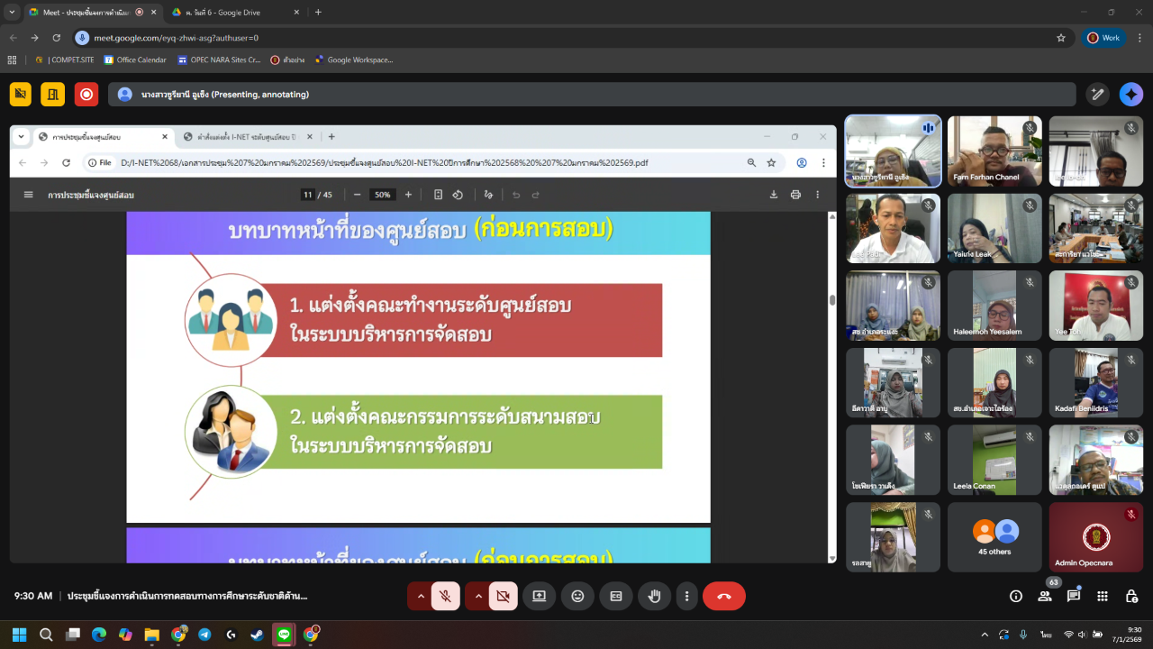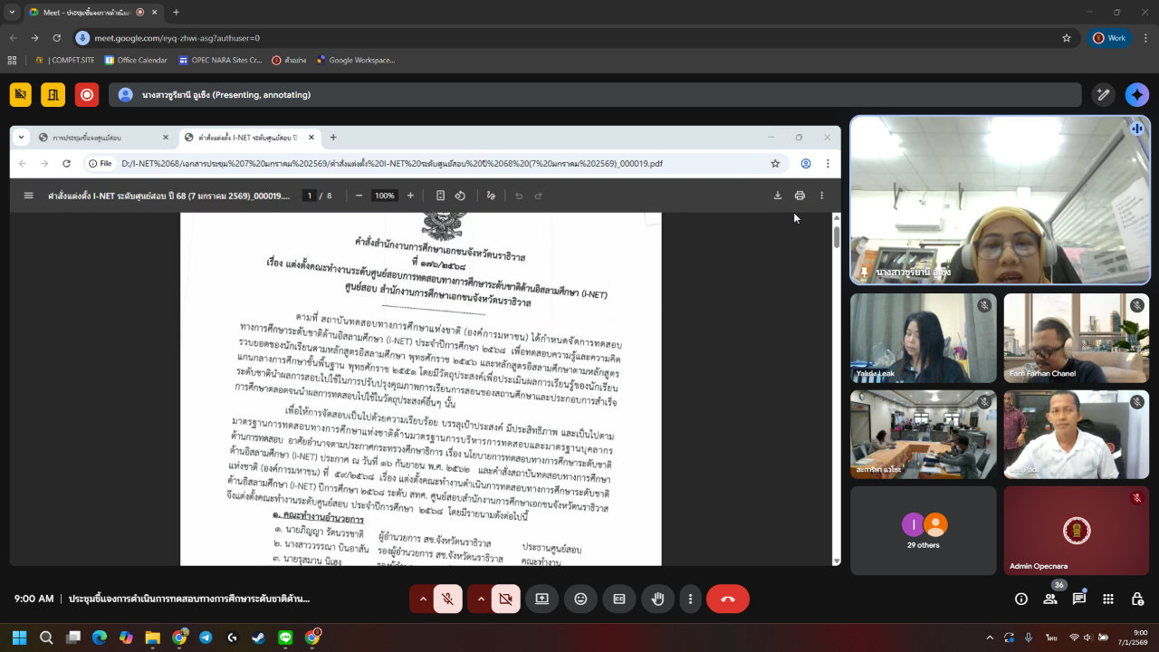 วันที่ 7 มกราคม พ.ศ. 2569 เวลา 09:00 น. นายภิญญา รัตนวรชาติ (ผอ.สช.จ.นราธิวาส) ประธานเปิดการประชุมชี้แจงการดำเนินการทดสอบทางการศึกษาระดับชาติด้านอิสลามศึกษา (I-NET) ปีการศึกษา 2568 (ระดับศูนย์สอบ) ผ่านระบบการประชุมออนไลน์ (Google Meet) วัตถุประสงค์เพื่อเสริมสร้างความรู้ความเข้าใจแก่ผู้เกี่ยวข้องเกี่ยวกับกระบวนการจัดสอบและการเตรียมความพร้อมของศูนย์สอบ และเพื่อให้การดำเนินการเป็นไปอย่างถูกต้อง มีความสอดคล้องตามมาตรฐานที่สถาบันทดสอบทางการศึกษาแห่งชาติ (องค์การมหาชน) กำหนดไว้ ทั้งนี้ มีผู้เข้าร่วมการประชุมฯ ประกอบด้วย นางสาววรรณา บินอาสัน (รอง ผอ.สช.จ.นราธิวาส) ผอ.สช.อำเภอ พร้อมด้วย คณะทำงานระดับศูนย์สอบ จำนวนรวมทั้งสิ้น 70 คน
