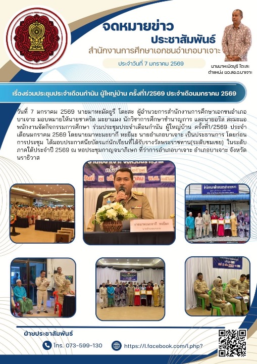 วันที่ 7 มกราคม 2569 นายมาหะมัดยูรี โตะสะ ผู้อำนวยการสำนักงานการศึกษาเอกชนอำเภอบาเจาะ มอบหมายให้นายชาคริต มะยาแมง นักวิชาการศึกษาชำนาญการ และนายอริส สะมะแอ พนักงานจัดกิจกรรมการศึกษา ร่วมประชุมประจำเดือนกำนัน ผู้ใหญ่บ้าน ครั้งที่1/2569 ประจำเดือนมกราคม 2569 โดยนายมาหะมะยากี หะยีมะ นายอำเภอบาเจาะ เป็นประธานการ โดยก่อนการประชุม ได้มอบประกาศนียบัตรแก่นักเรียนที่ได้รับรางวัลพระราชทาน(ระดับชมเชย) ในระดับภาคใต้ ประจำปี 2569 ณ หอประชุมกาญจนาภิเษก ที่ว่าการอำเภอบาเจาะ อำเภอบาเจาะ จังหวัดนราธิวาส