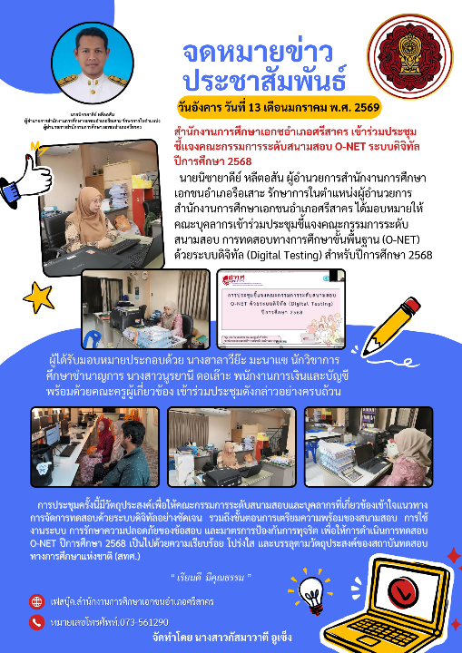 วันอังคาร วันที่ 13 เดือนมกราคม พ.ศ. 2569 นายนิซายาดีย์ หลีตอสัน ผู้อำนวยการสำนักงานการศึกษาเอกชนอำเภอรือเสาะ รักษาการในตำแหน่งผู้อำนวยการสำนักงานการศึกษาเอกชนอำเภอศรีสาคร ได้มอบหมายให้คณะบุคลากรเข้าร่วมประชุมชี้แจงคณะกรรมการระดับสนามสอบ การทดสอบทางการศึกษาขั้นพื้นฐาน (O-NET) ด้วยระบบดิจิทัล (Digital Testing) สำหรับปีการศึกษา 2568 ผู้ได้รับมอบหมายประกอบด้วย นางฮาลาวีย๊ะ มะนาแซ นักวิชาการศึกษาชำนาญการ นางสาวนูรยานี ดอเล๊าะ พนักงานการเงินและบัญชี พร้อมด้วยคณะครูผู้เกี่ยวข้อง เข้าร่วมประชุมดังกล่าวอย่างครบถ้วน การประชุมครั้งนี้มีวัตถุประสงค์เพื่อให้คณะกรรมการระดับสนามสอบและบุคลากรที่เกี่ยวข้องเข้าใจแนวทางการจัดการทดสอบด้วยระบบดิจิทัลอย่างชัดเจน รวมถึงขั้นตอนการเตรียมความพร้อมของสนามสอบ การใช้งานระบบ การรักษาความปลอดภัยของข้อสอบ และมาตรการป้องกันการทุจริต เพื่อให้การดำเนินการทดสอบ O-NET ปีการศึกษา 2568 เป็นไปด้วยความเรียบร้อย โปร่งใส และบรรลุตามวัตถุประสงค์ของสถาบันทดสอบทางการศึกษาแห่งชาติ (สทศ.)