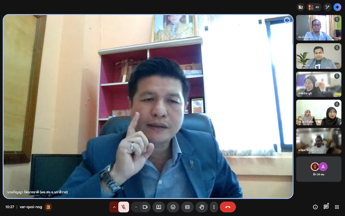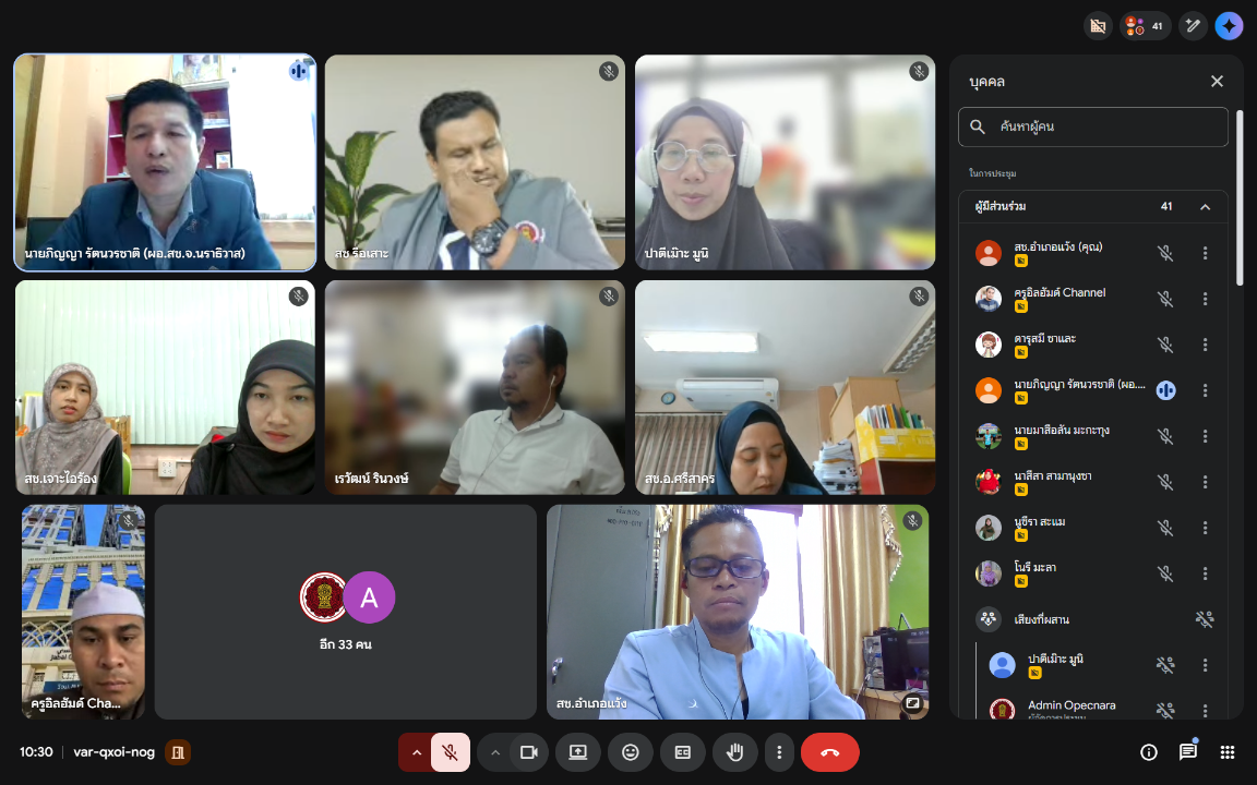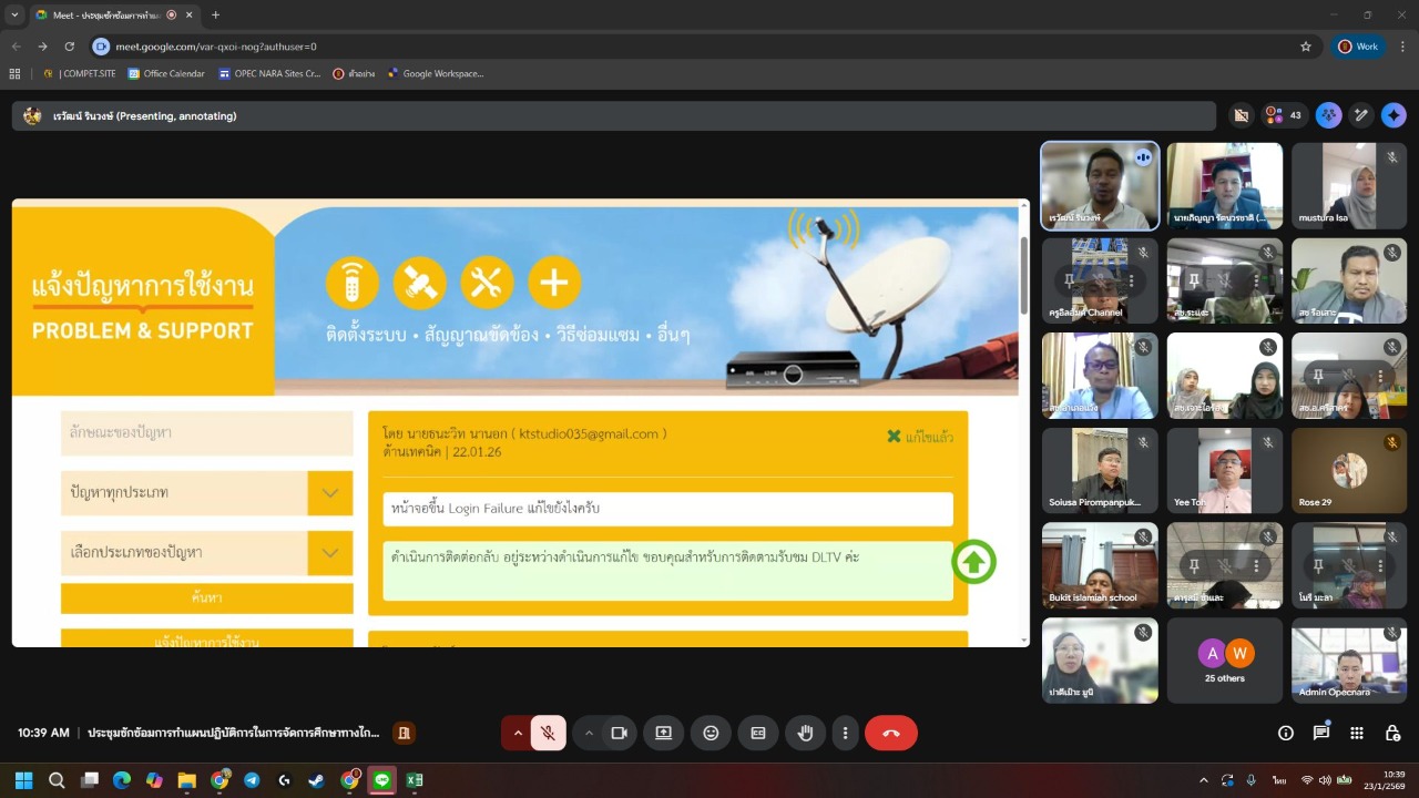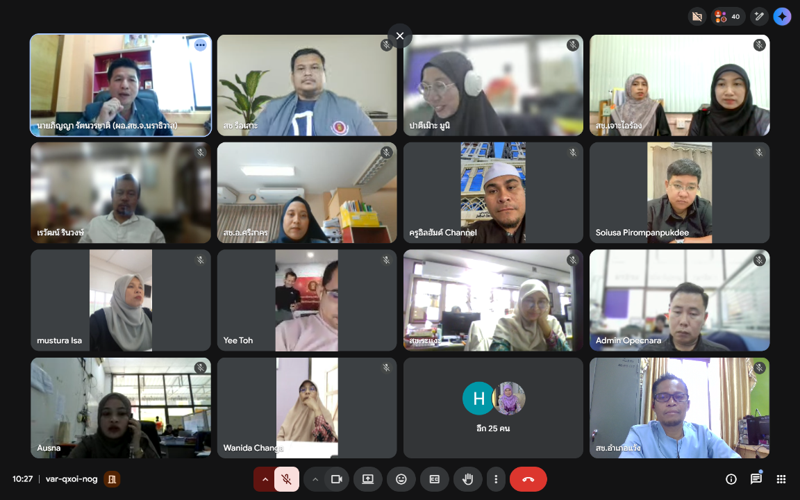 วันที่ 23 มกราคม พ.ศ. 2569 เวลา 10.00 น. นายมะยูฮา มามะ ผู้อำนวยการสำนักงานการศึกษาเอกชนอำเภอสุไหงปาดีก รักษาการในตำแหน่งผู้อำนวยการสำนักงานการศึกษาเอกชนอำเภอแว้ง มอบหมายให้นายชัยยันต์ สำเร พนักงานปฏิบัติการด้านคอมพิวเตอร์ เข้าร่วมประชุมซักซ้อมการจัดทำแผนการดำเนินงานการจัดการศึกษาทางไกลผ่านดาวเทียม (DLTV) ผ่านระบบการประชุมออนไลน์ (Google Meet)