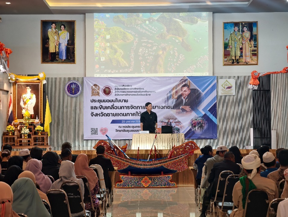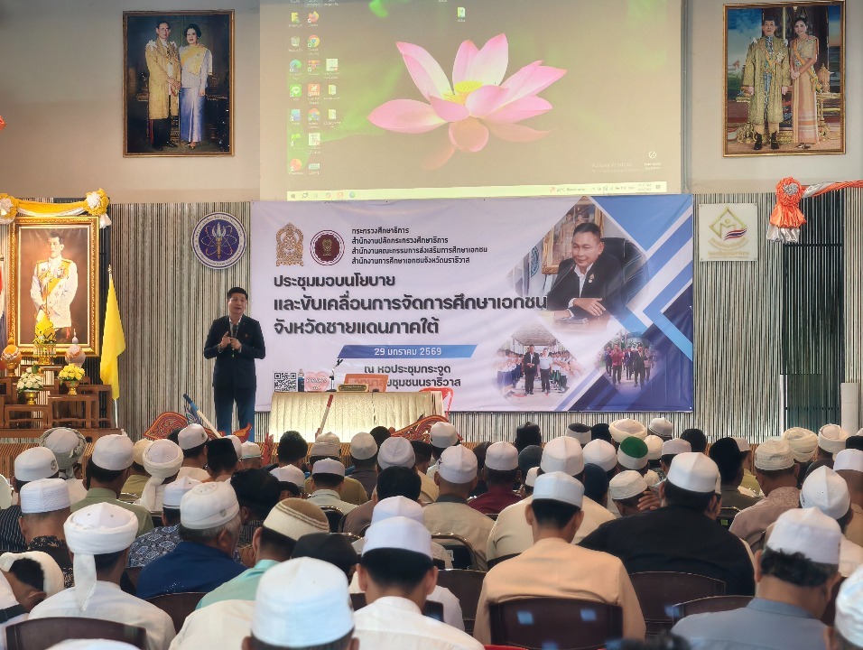 วันที่ 29 มกราคม 2569 เวลา 09.00 น. นายอับดุลเลาะ กะเด็ง ผู้อำนวยการสำนักงานการศึกษาเอกชนอำเภอระแงะ รักษาการในตำแหน่ง ผู้อำนวยการสำนักงานการศึกษาเอกชนอำเภอสุคิริน มอบหมายให้นายรอซาลี เลาะโอะ ผู้ชำนาญการอิสลามศึกษา เข้าร่วมรับฟังนโยบายและขับเคลื่อนการจัดการศึกษาเอกชนจังหวัดชายแดนใต้ ณ หอประชุมกระจูด วิทยาลัยชุมชนนราธิวาส อำเภอเมืองนราธิวาส จังหวัดนราธิวาส โดยมีนายกฤษณนันท์ กำไร (รองผู้ราชการจังหวัดนราธิวาส) ประธานในพิธีเปิดการประชุม โดย ดร.คมกฤช จันทร์ขจร (ผู้ตรวจราชการกระทรวงศึกษาธิการ) ให้เกียรติร่วมมอบนโยบายและแนวทางการขับเคลื่อน การจัดการศึกษาเอกชนในพื้นที่จังหวัดชายแดนใต้ โดยมี นายภิญญา รัตนวรชาติ (ผอ.สช.จ.นราธิวาส) เป็นผู้กล่าวรายงาน ในการประชุมครั้งนี้ มีผู้เข้าร่วมประกอบด้วย ผู้บริหารหน่วยงานการศึกษา ผู้บริหารสถานศึกษาเอกชน คณะครู และบุคลากรทางการศึกษา ตลอดจนหน่วยงานที่เกี่ยวข้อง เข้าร่วมรับฟังนโยบายและแนวทางการดำเนินงาน เพื่อขับเคลื่อนการจัดการศึกษาเอกชนให้มีคุณภาพและสอดคล้องกับบริบทพื้นที่ จำนวนรวมกว่า 600 คน