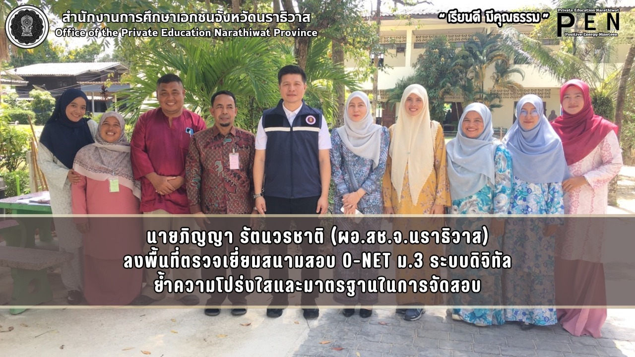 นายภิญญา รัตนวรชาติ (ผอ.สช.จ.นราธิวาส) ลงพื้นที่ ตรวจเยี่ยมสนามสอบการดำเนินการทดสอบทางการศึกษาระดับชาติขั้นพื้นฐาน (O-NET) ระดับชั้นมัธยมศึกษาปีที่ 3 (Digital Testing) ปีการศึกษา 2568 โรงเรียนตายุลอิสลาม โรงเรียนศิริธรรมวิทยา โรงเรียนอัดดีนียาตุลอิสลามียะห์ โรงเรียนเจริญวิทยานุสรณ์ (อ.บาเจาะ) โรงเรียนพัฒนศาสน์วิทยา (อ.เมืองนราธิวาส) โรงเรียนอัครศาสน์วิทยา (อ.ยี่งอ) เพื่อร่วมกำกับติดตาม และตรวจสอบความเรียบร้อยของการจัดสอบ ให้เป็นไปตามระเบียบและแนวทาง พร้อมร่วมสร้างความมั่นใจในความโปร่งใสยุติธรรมของการจัดสอบ