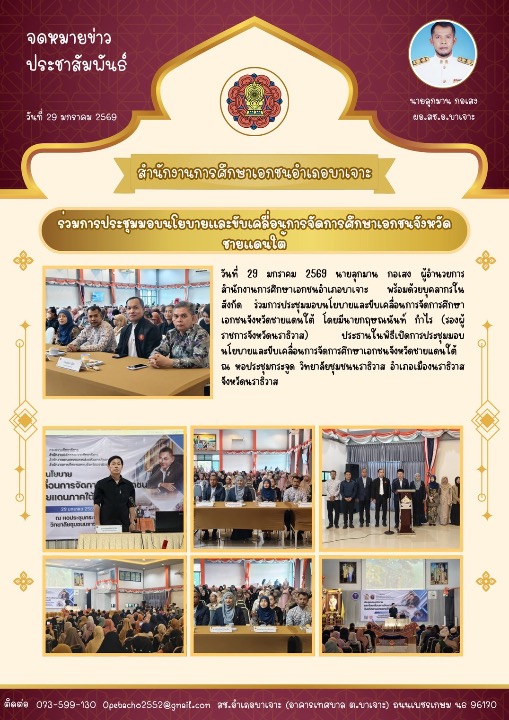 วันที่ 29 มกราคม 2569 นายลุกมาน กอเสง ผู้อำนวยการสำนักงานการศึกษาเอกชนอำเภอบาเจาะ พร้อมด้วยบุคลากรในสังกัด ร่วมการประชุมมอบนโยบายและขับเคลื่อนการจัดการศึกษาเอกชนจังหวัดชายแดนใต้ โดยมีนายกฤษณนันท์ กำไร (รองผู้ราชการจังหวัดนราธิวาส) ประธานในพิธีเปิดการประชุมมอบนโยบายและขับเคลื่อนการจัดการศึกษาเอกชนจังหวัดชายแดนใต้ ณ หอประชุมกระจูด วิทยาลัยชุมชนนราธิวาส อำเภอเมืองนราธิวาส จังหวัดนราธิวาส