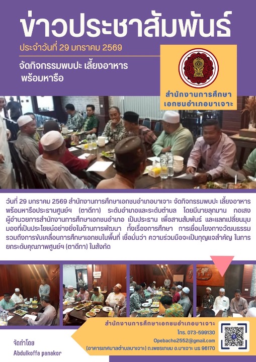 วันที่ 29 มกราคม 2569 สำนักงานการศึกษาเอกชนอำเภอบาเจาะ จัดกิจกรรมพบปะ เลี้ยงอาหาร พร้อมหารือประธานศูนย์ฯ (ตาดีกา) ระดับอำเภอและระดับตำบล โดยมีนายลุกมาน กอเสง ผู้อำนวยการสำนักงานการศึกษาเอกชนอำเภอ เป็นประธาน เพื่อสานสัมพันธ์ และแลกเปลี่ยนมุมมองที่เป็นประโยชน์อย่างยิ่งในด้านการพัฒนา ทั้งเรื่องการศึกษา การเชื่อมโยงทางวัฒนธรรม รวมถึงการขับเคลื่อนการศึกษาเอกชนในพื้นที่ เชื่อมั่นว่า ความร่วมมือจะเป็นกุญแจสำคัญ ในการยกระดับคุณภาพศูนย์ฯ (ตาดีกา) ในสังกัด