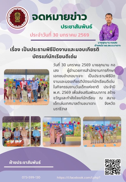 วันที่ 30 มกราคม 2569 นายลุกมาน กอเสง ผู้อำนวยการสำนักงานการศึกษาเอกชนอำเภอบาเจาะ เป็นประธานพิธีปิดงานและมอบเกียรติบัตรแก่นักเรียนดีเด่น ในกิจกรรมงานวันเด็กแห่งชาติ ประจำปี พ.ศ. 2569 เพื่อส่งเสริมพัฒนาการ สร้างขวัญและกำลังใจแก่นักเรียน ณ สนามเด็กเล่นเทศบาลตำบลบาเจาะ จังหวัดนราธิวาส